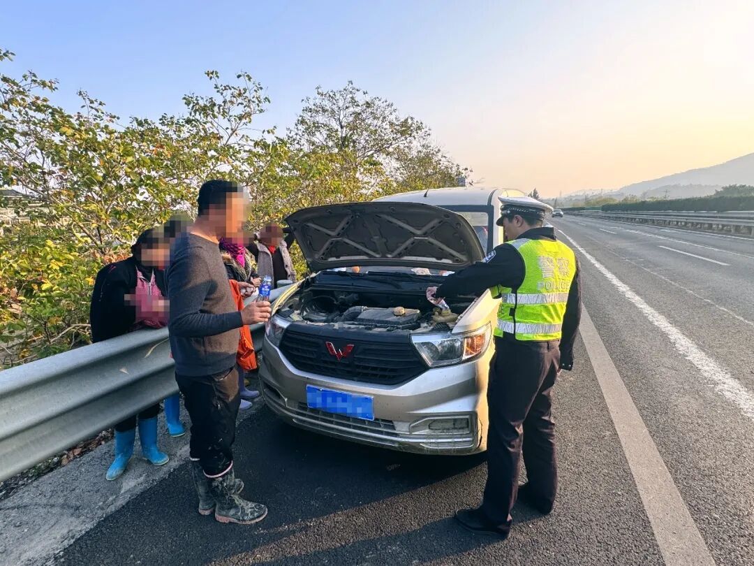 ▲2月21日下午,四大队民警巡逻至天福服务区路段时,发现一小车因水箱缺水、水温过高停在应急车道。民警立即做好安全防护,用警车备用纯净水为水箱加水,车辆很快恢复正常。民警叮嘱驾驶员出行前务必检查车况,高速上遇故障或轻微事故牢记“车靠边、快警示、人撤离、即报警”。