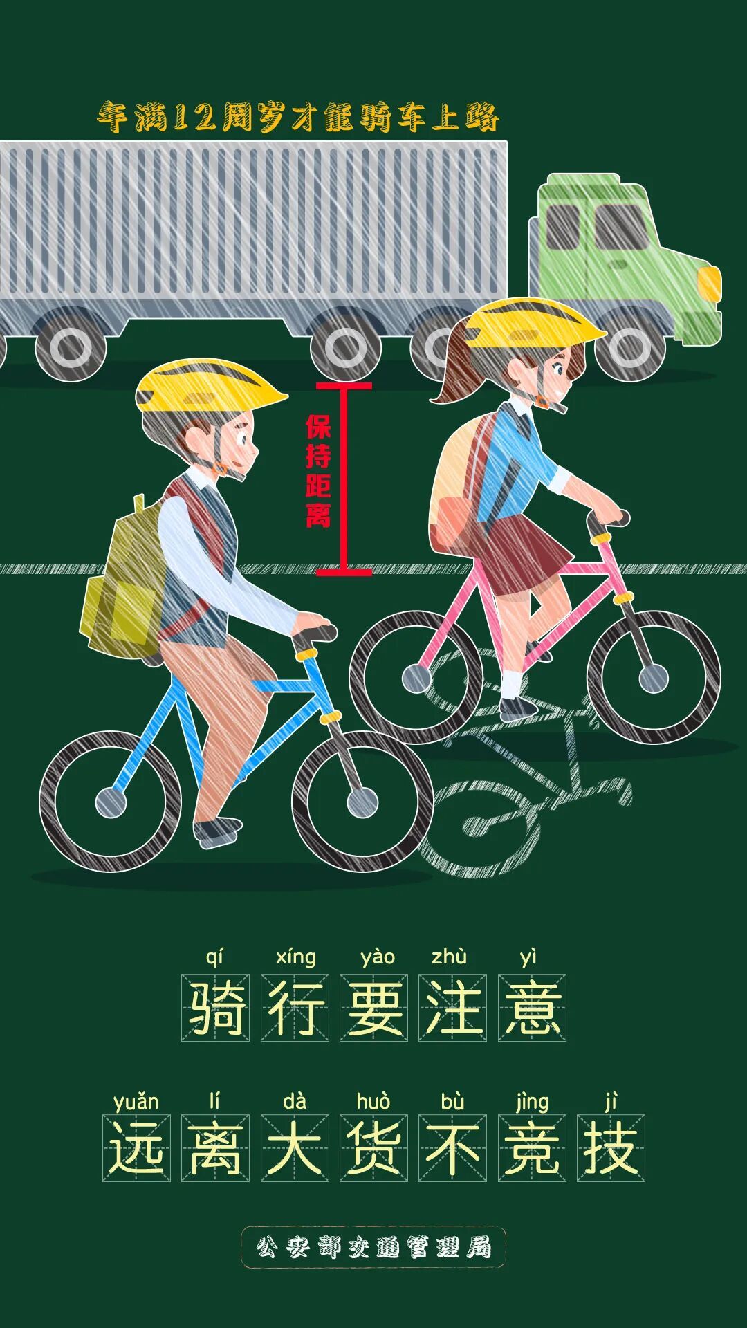 骑行注意 骑乘电动车、摩托车出行的学生及家长 请注意正确佩戴“安全头盔” 电动自行车只允许搭载1名 身高1.6米以下未成年人 需做到各行其道 不闯红灯、不逆行 远离大型车辆盲区