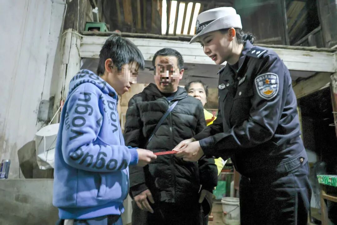 民警向受助学子发放助学红包 春运启幕,人员流动频繁,交通安全更是民警放不下的牵挂。每走访一户,民警都会结合基层法治宣传职责,把交通安全知识融入新春叮嘱,用通俗易懂的语言讲解春运出行注意事项:“春运路上人多车多,一定要看好孩子,遵守交通规则,平平安安、健健康康,才是过年最大的福气。”一句句贴心提醒,一声声法治寄语,裹着浓浓的关爱,为每个家庭筑牢平安防线,也让“尊法、学法、守法、用法”的理念,伴着年的气息走进千家万户。