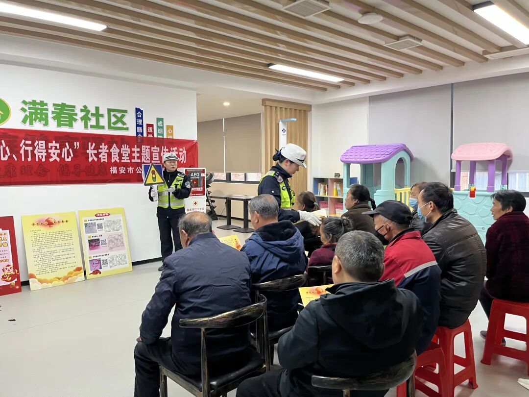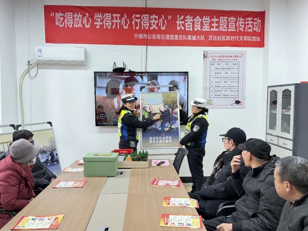 为持续巩固老年群体交通安全意识,切实预防和减少涉及老年人的道路交通事故发生,宁德公安交警立足辖区实际,持续深入各长者食堂、孝老食堂等老年人群聚集场所,扎实开展“吃得放心、学得开心、行得安心”主题交通安全宣传活动。 什么是“1630” 简单来说,就是围绕1个宣传主题 落实“6个做到” 在30分钟内完成一次高质量的安全宣教 “长者食堂'1630'普法模式” Part.01 1个宣传主题 “吃得放心、学得开心、行得安心” 长者食堂主题宣传活动。 Part.02 6个做到 提前1天通知到位; 观看1条老人出行警示案例短片; 摆放1套老年群体出行知识展板; 分发1张老年人安全出行承诺书; 组织1场互动游戏; 分发1件实用宣传奖品。 Part.03 30分钟时间 开展活动时间安排在餐前 或者餐后的30分钟内。 提前通知到位 一份“预约式”的期待 为确保活动知晓率和参与度,每次活动前,宁德公安交警通过食堂工作人员口头转告、发放宣传单页、张贴主题海报等多种渠道,将活动时间、地点、内容提前告知老年群众,让大家有时间提前安排、心中有数。