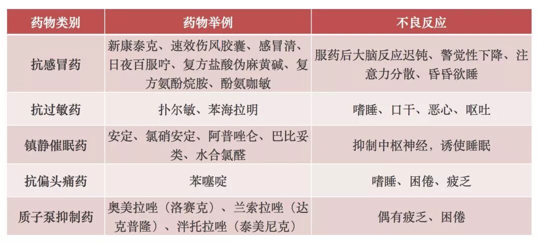 不良反应二:嗜睡 许多药物中含有中枢抑制类成分,从而使驾驶人员产生嗜睡、困倦、疲乏等症状。例如:
