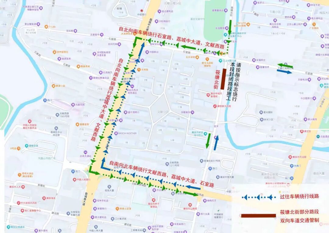关于筱塘北街(莆田市城市管理局)路段占道施工 交通管制的通告 因城厢区2025年老旧小区改造项目—文献小区改造工程占道施工需要,为保证施工期间道路交通安全、通畅,根据《中华人民共和国道路交通安全法》第三十九条规定,决定对筱塘北街(莆田市城市管理局)路段实行临时交通管制。具体通告如下: 一、管制时间:2026年3月7日至2026年4月7日。 二、管制要求:筱塘北街(莆田市城市管理局)路段实行全幅封闭施工,车辆行人需绕行。请广大市民提前安排好出行方式和线路,并根据路段路口周边设置的交通标志指示提前绕行。
