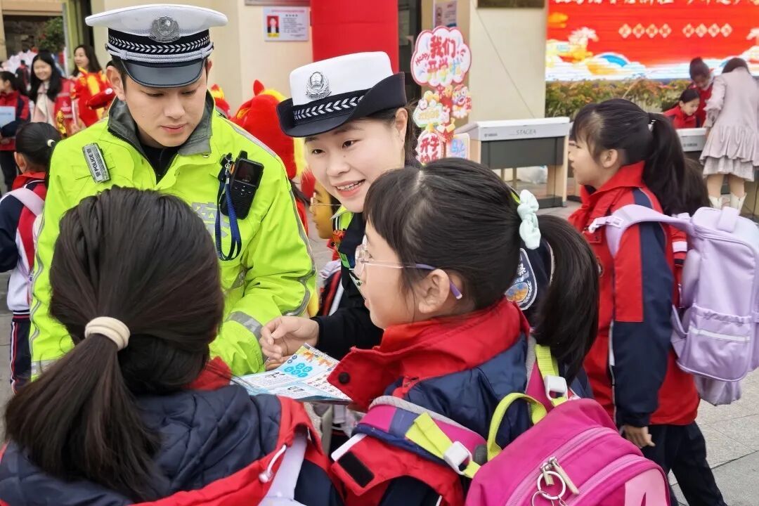 民警辅警们疏堵保畅、引导车流,细心护送孩子们安全通过马路,规范接送车辆停放秩序,用最踏实的守护,撑起上学路上的平安屏障。 安全宣传,近在身旁
