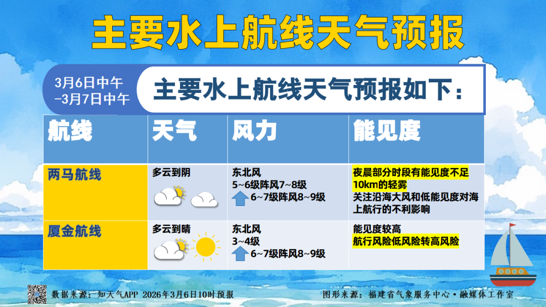 中南部沿海海区6~7日和 9~10日有7~8级 阵风9~10级的东北大风 其余时段无平均风8级及以上大风 近期海上大风灾害风险较高 注意防范沿海大风对航运、 滨海旅游、渔业等的不利影响 同时注意主要水上航线 两马航线夜晨部分时段 有能见度不足10km的轻雾 厦金航线海上风力增强 航行风险低风险转高风险