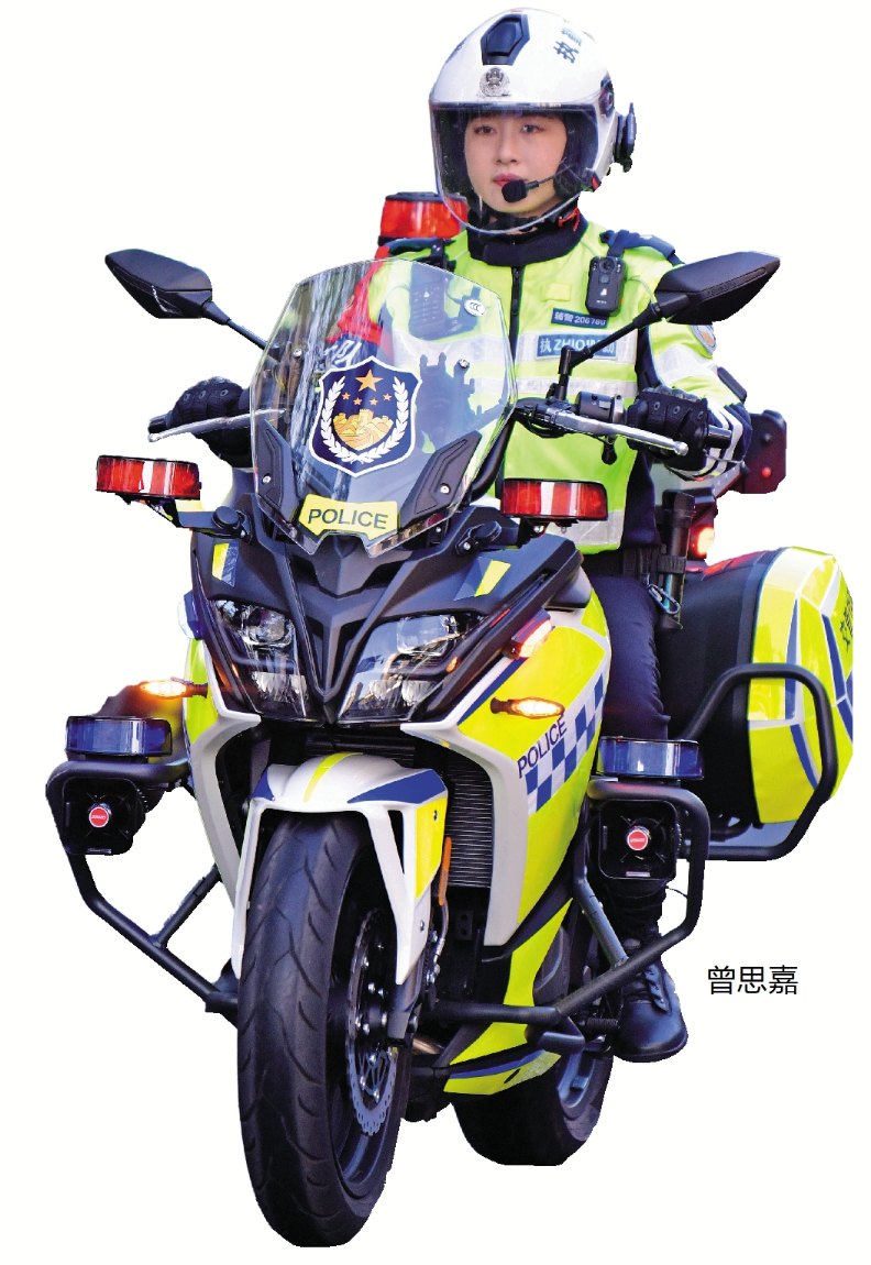 2017年,施善莲从街道办考入市局指挥中心,后调至交警岗位,近十年深耕信号灯管控与调优工作。她从分不清方向的“路盲”,成长为对岛内路网了然于心的“活地图”,在方寸指挥台前守护城市交通脉络。工作中,她早晚高峰紧盯路况,通过视频巡查结合高德预警,手动管控学校、医院等易拥堵点位信号灯;遇交通异常或群众紧急就医,及时切换手动模式、规划绿波路线,开辟生命通道。 面对群众的诉求,她以耐心倾听、用心解释,赢得理解,用专业与坚守践行岗位职责。 曾思嘉 热爱铁骑的“跨界女神”