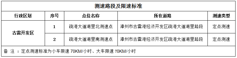 关于启用古雷港经济开发区疏港大道 定点测速交通违法采集设备的通告 为规范古雷港经济开发区道路交通秩序,提升城市交通管理水平与文明程度,为广大群众出行创造安全畅通的交通环境,古雷交管大队现决定对疏港大道实行限速管理并启用2套定点测速设备,采集驾驶机动车超速违法行为,现将具体的启用事项通告如下,并依照《中华人民共和国道路交通安全法》有关规定,对相应违法行为进行处罚。路段已设置限速提示牌,望广大驾驶人相互转告,自觉遵守交通法律法规,安全驾驶,文明出行,共同维护道路交通秩序。 本通告自2026年3月12日起实施。 漳州市公安局交通管理支队 漳州古雷港经济开发区大队 2026年3月5日 测速路段及限速标准