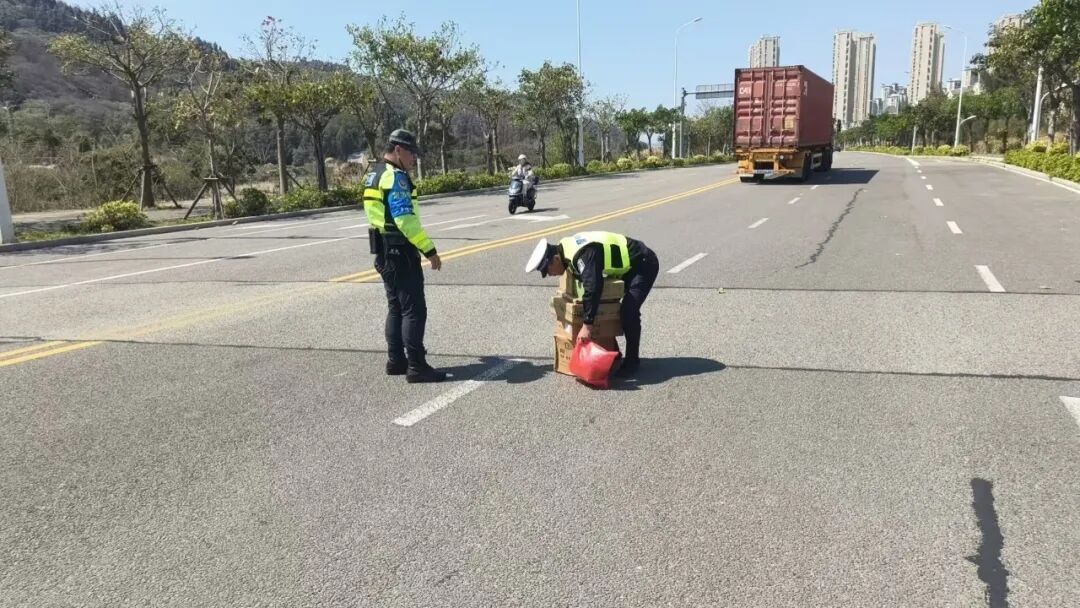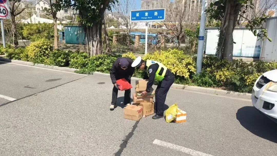 为切实筑牢道路交通安全防线 平潭公安交警骑警大队 持续加大路面巡逻管控力度 及时排查清理各类安全隐患 全力守护辖区道路安全畅通 3月12日11时许,执勤民警在天山东路巡逻时,发现行车道内有快递包裹散落路面,过往车辆纷纷紧急避让,极易引发追尾、刮擦事故,安全隐患极大。