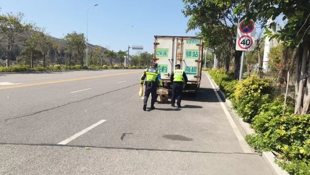 民警立即做好安全防护,警示过往车辆减速慢行,在确保安全的前提下快速清理散落物品,及时恢复道路正常通行。随后民警联系涉事物流公司前来认领,现场对货运驾驶员进行货运安全警示教育,提醒其出车前务必检查车辆状况、加固捆绑货物、关闭锁紧货厢门,杜绝因货物固定不牢、隐患车辆上路引发货物散落、掉落等危险情况,严防危及自身及他人出行安全,避免造成交通事故和财产损失。