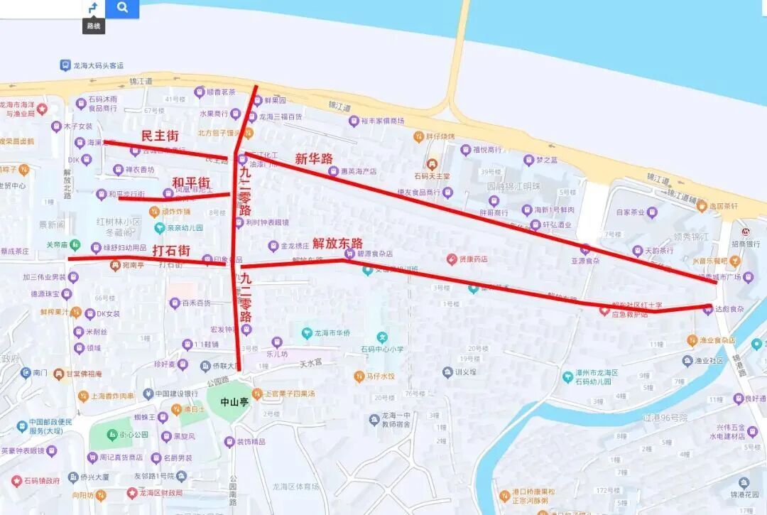 因漳州市石码历史文化街区保护提升项目工程开工建设,需在解放东路、打石街、和平街、民主街、九二零路、新华路进行占道施工,为保障施工期间道路交通安全、畅通、有序,施工期间将进行交通管制,现将有关事项通告如下: 一、管制路段: 解放东路、打石街、和平街、民主街、九二零路、新华路全路段。