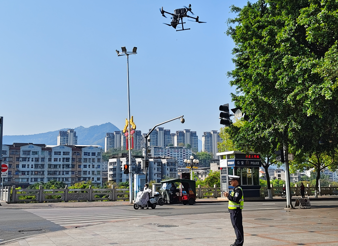 在漳平城区重点路口、路段,无人机高空巡航、实时巡查,一旦发现电动车驾乘人员未戴安全头盔、行人横穿马路、机动车不礼让行人等显见性交通违法行为,执勤人员立即通过机载喊话系统“点名式”精准劝导,督促当事人现场纠正,形成“发现即提醒、提醒即纠正”的快速处置闭环。
