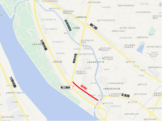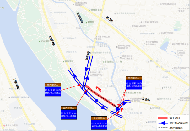 施工路段示意图 三、绕行路径 交通限制期间,途经金洲街(新华南路路口—义全街路口)路段的车辆,建议:由江滨北路—义全街绕行。