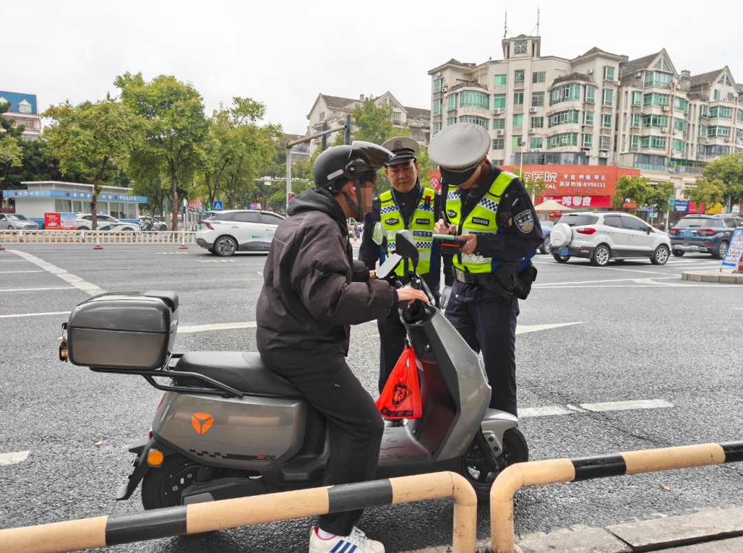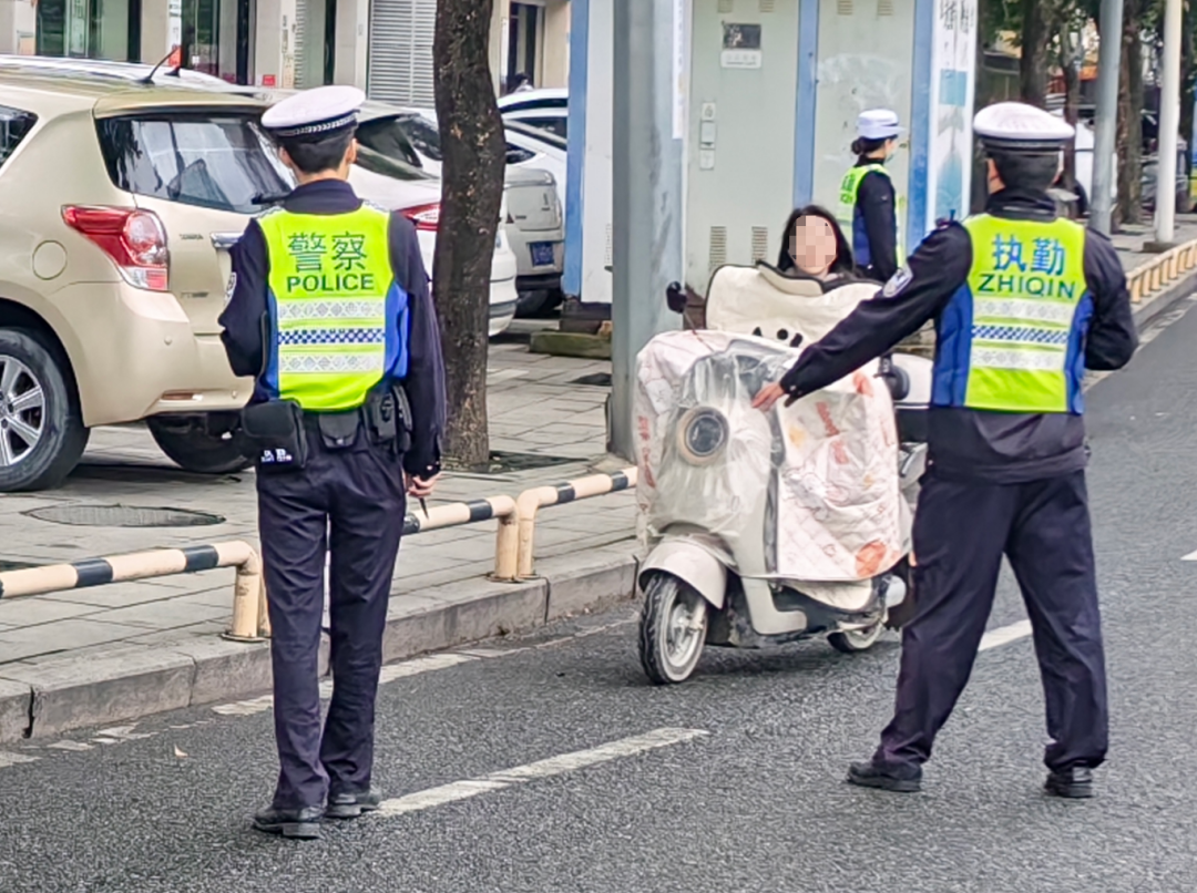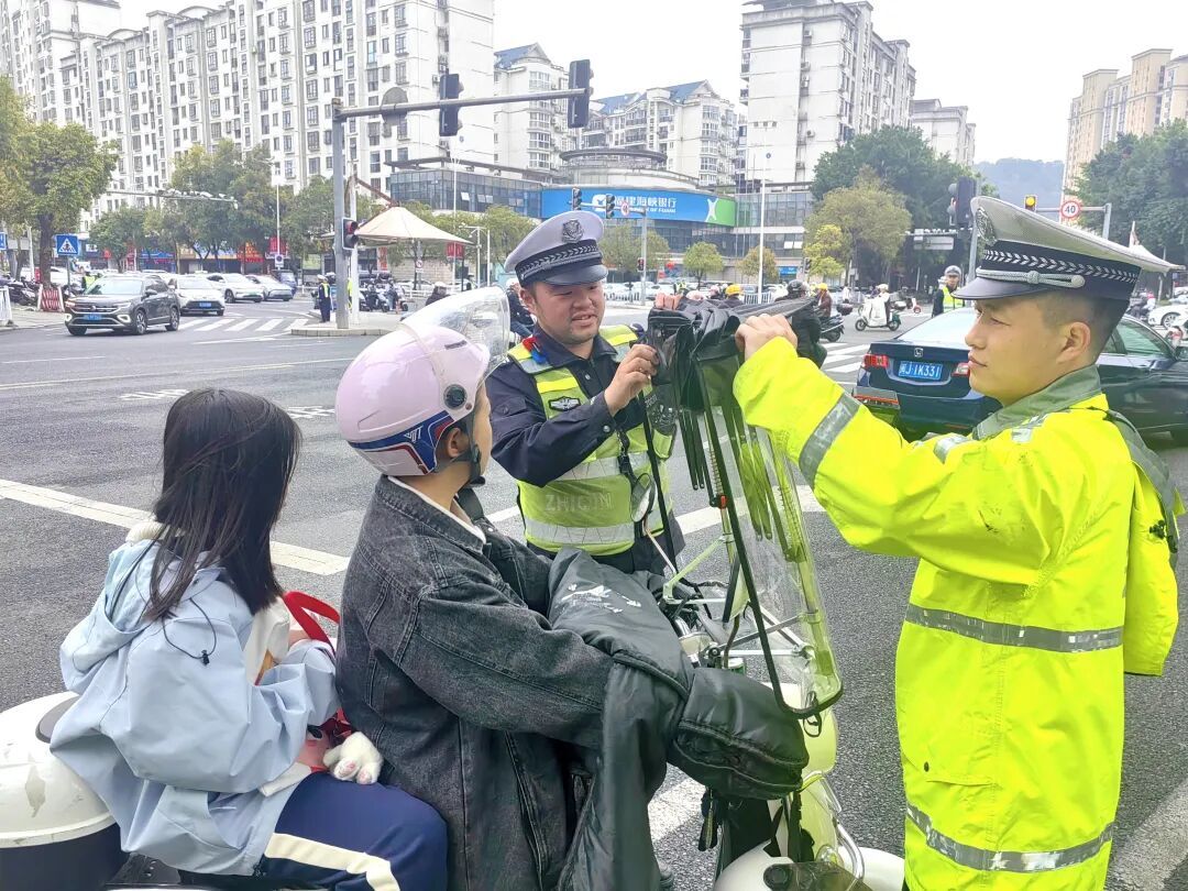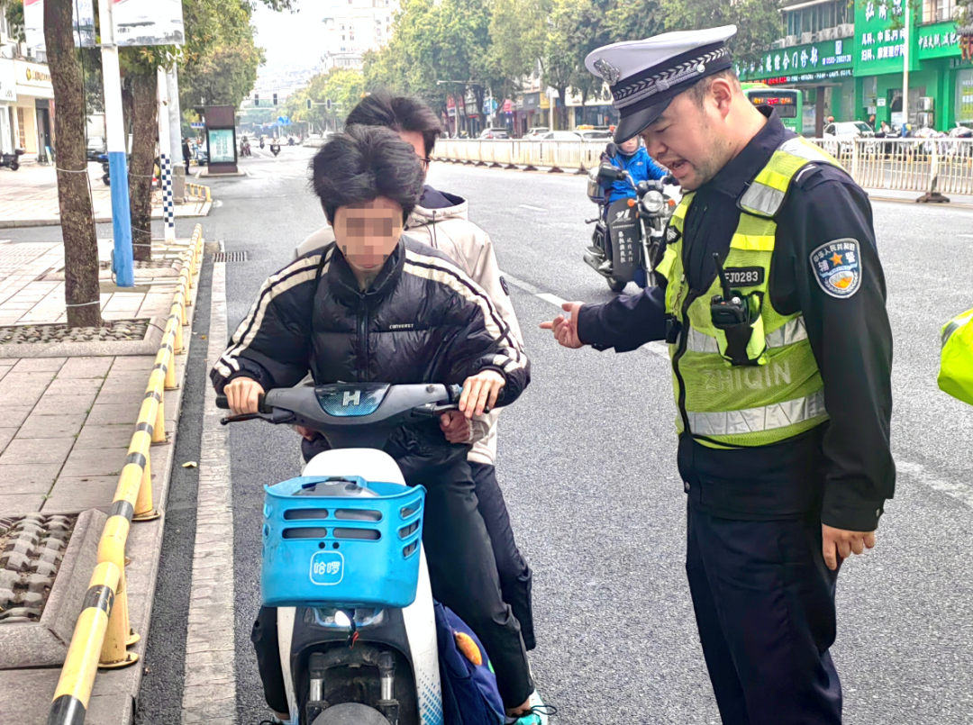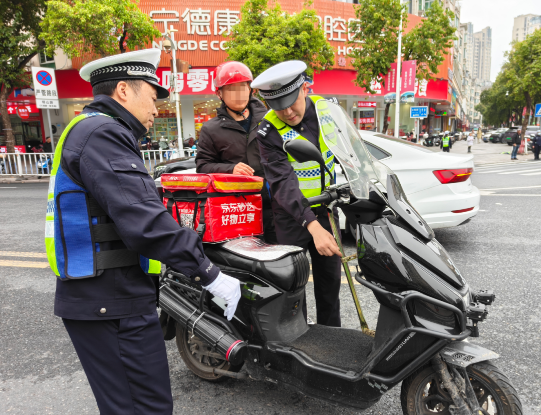 执勤警力在城区主干道等重点路段设置卡点,采取“教育+处罚”相结合的方式。针对骑乘车辆未佩戴安全头盔的,民警现场进行“手把手”教学,督促其正确佩戴;对于非法加装遮阳伞的,一律现场拆除,消除安全隐患……