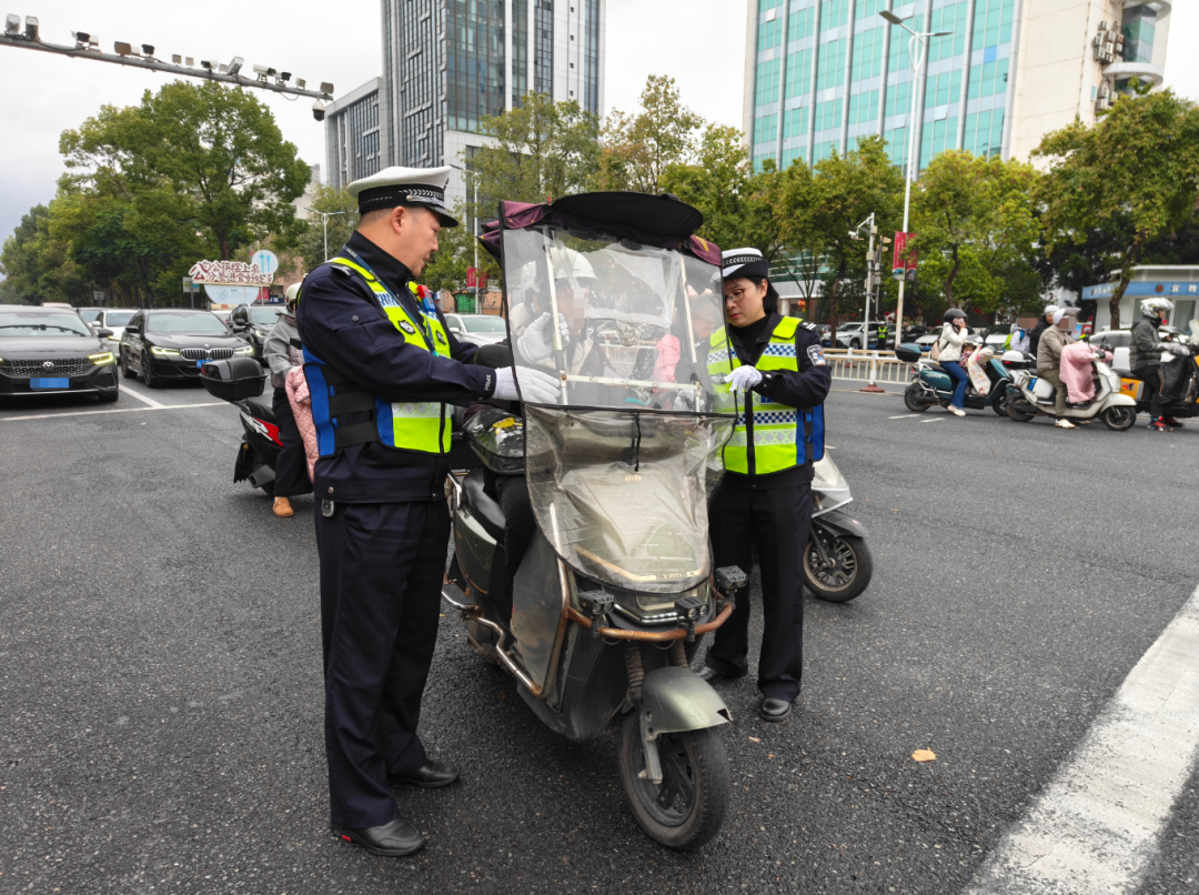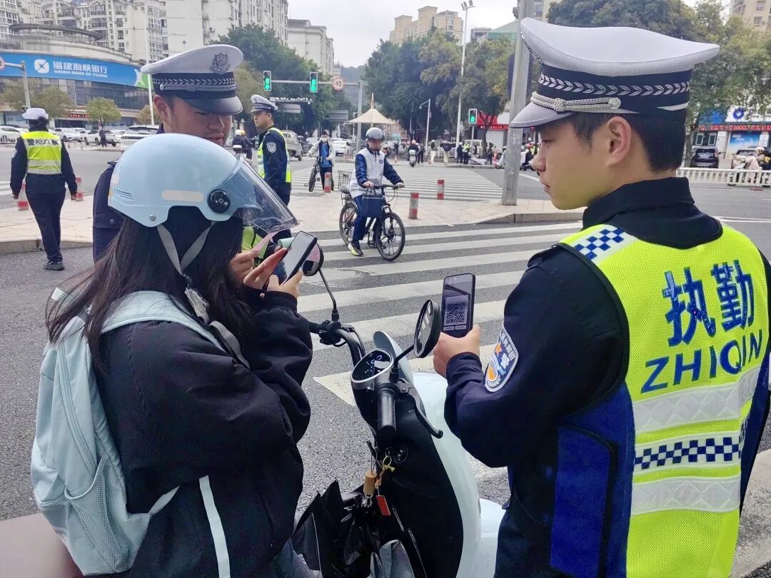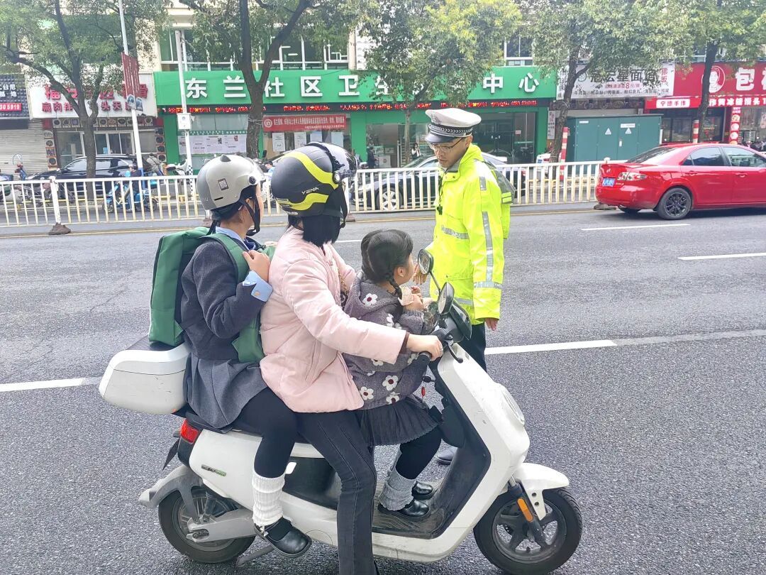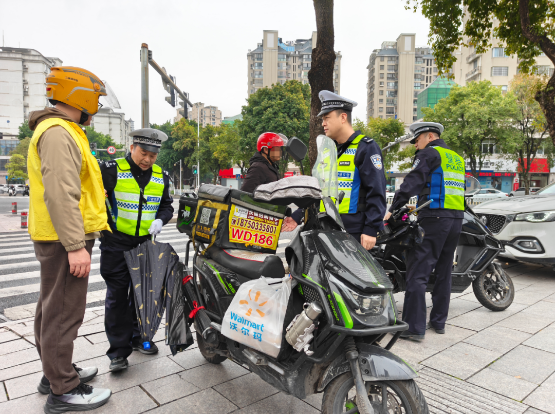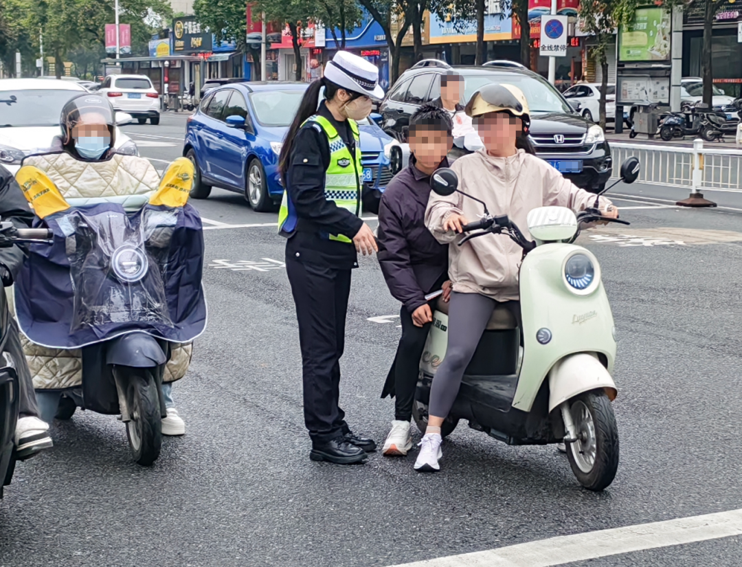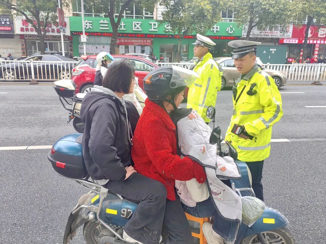 执勤警力在城区主干道等重点路段设置卡点,采取“教育+处罚”相结合的方式。针对骑乘车辆未佩戴安全头盔的,民警现场进行“手把手”教学,督促其正确佩戴;对于非法加装遮阳伞的,一律现场拆除,消除安全隐患……