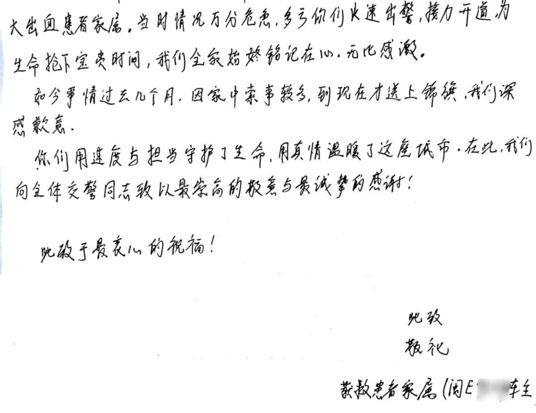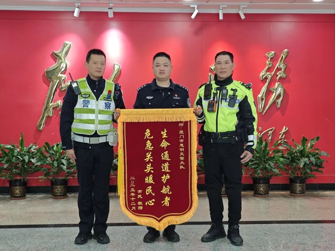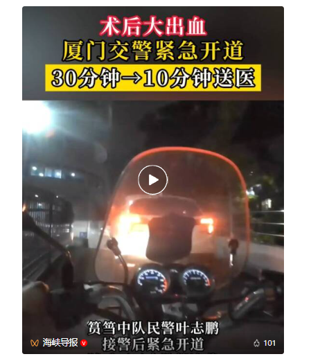 字里行间 满是真挚感激 寥寥数语 牵出了一段发生在数月前 惊心动魄却又温暖人心的 生命接力故事 ⏱️争分夺秒,晚高峰抢出生命通道 时间拨回2025年 12月3日18时30分许 正值晚高峰 思明交警大队接到紧急求助 一名患者术后大出血 正紧急赶往 厦门大学第一附属医院 情况万分危急! 筼筜中队民警叶志鹏接警后 立即驾驶警用摩托车 拉响警笛、火速前往接应 找到求助车辆后 他一路喊话开道 在滚滚车流中 开辟出一条“绿色通道”