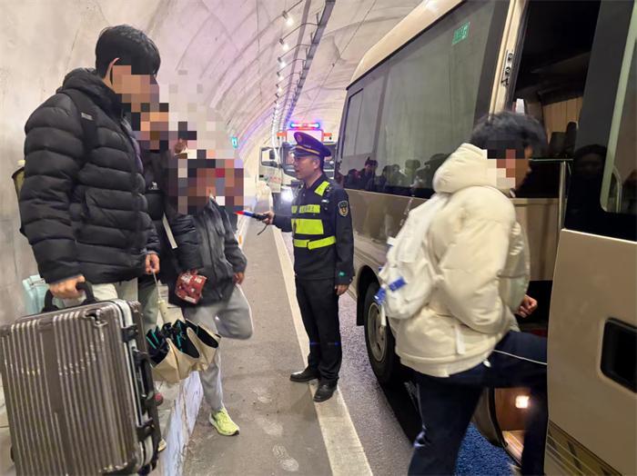 3月20日10时20分许,三明高速执法支队执法人员在莆炎高速三明往福州方向岩头山隧道巡查时,发现一辆客运包车因发动机故障停靠主车道,车上十余名乘客正站在隧道边沟处。 该路段地处隧道弯道,视线条件差,安全风险突出。为全力保障现场人员安全,执法人员立即从隧道口布设安全锥筒至故障车辆位置,形成连续安全防护区域,并安排专人加强后方来车警示,引导过往车辆减速谨慎通行,同步将现场情况通报高速交警。经现场核查,该车营运证件及包车手续齐全有效,车上乘客均为清流职专赴福州参加考试的学生。