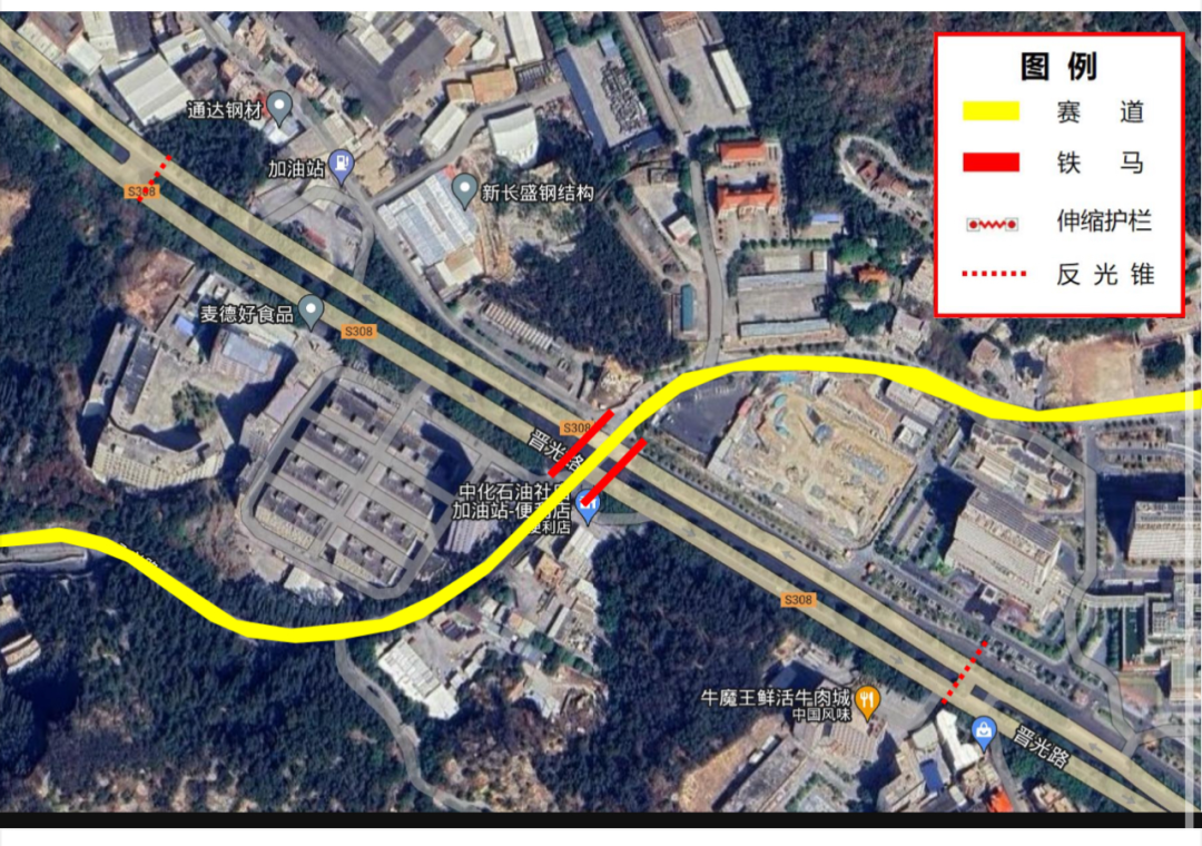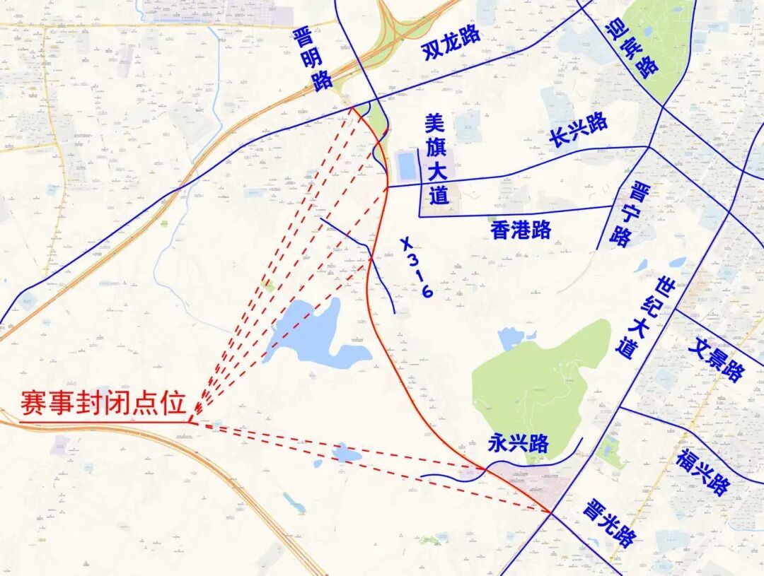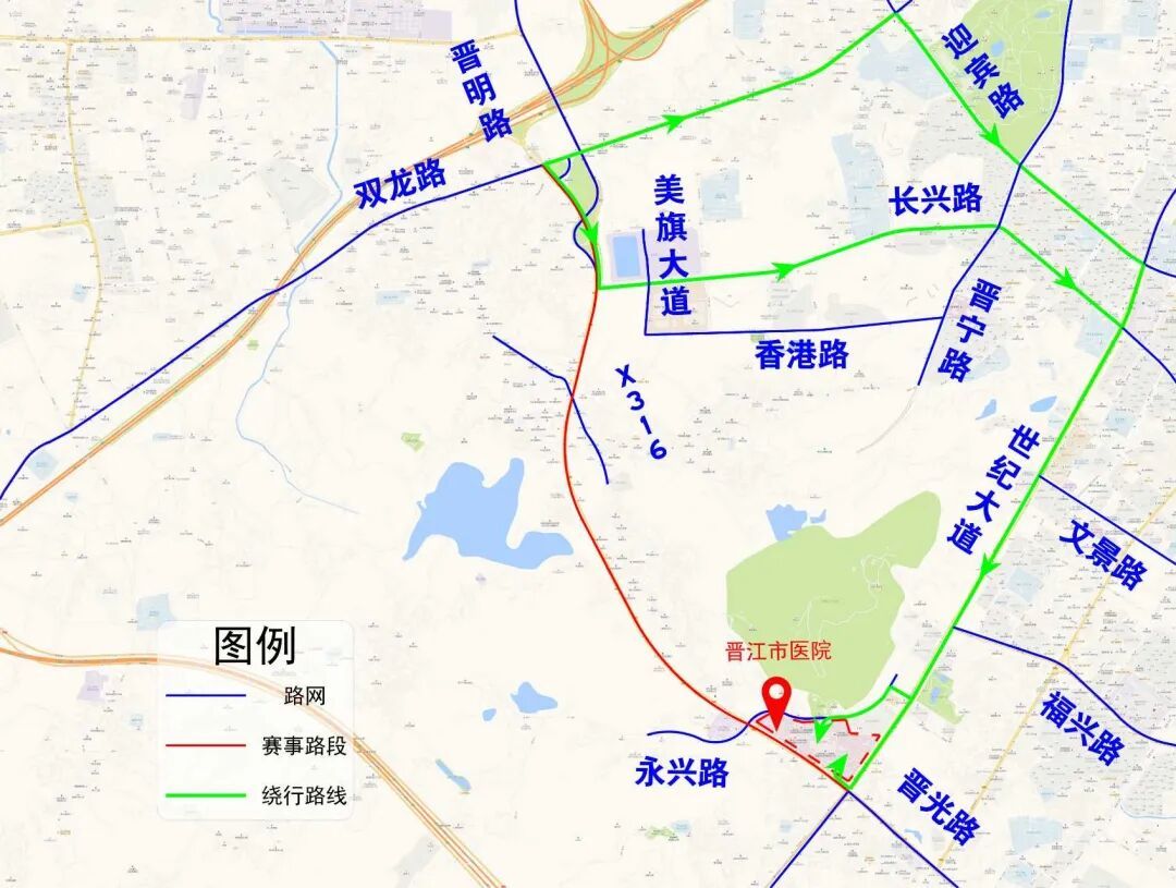 7.建议绕行路线:需通过晋光路赛事封闭路段往返,牛山高速口至晋江南方向的车辆,建议从晋光路—长兴路(或双龙路)—世纪大道绕行。