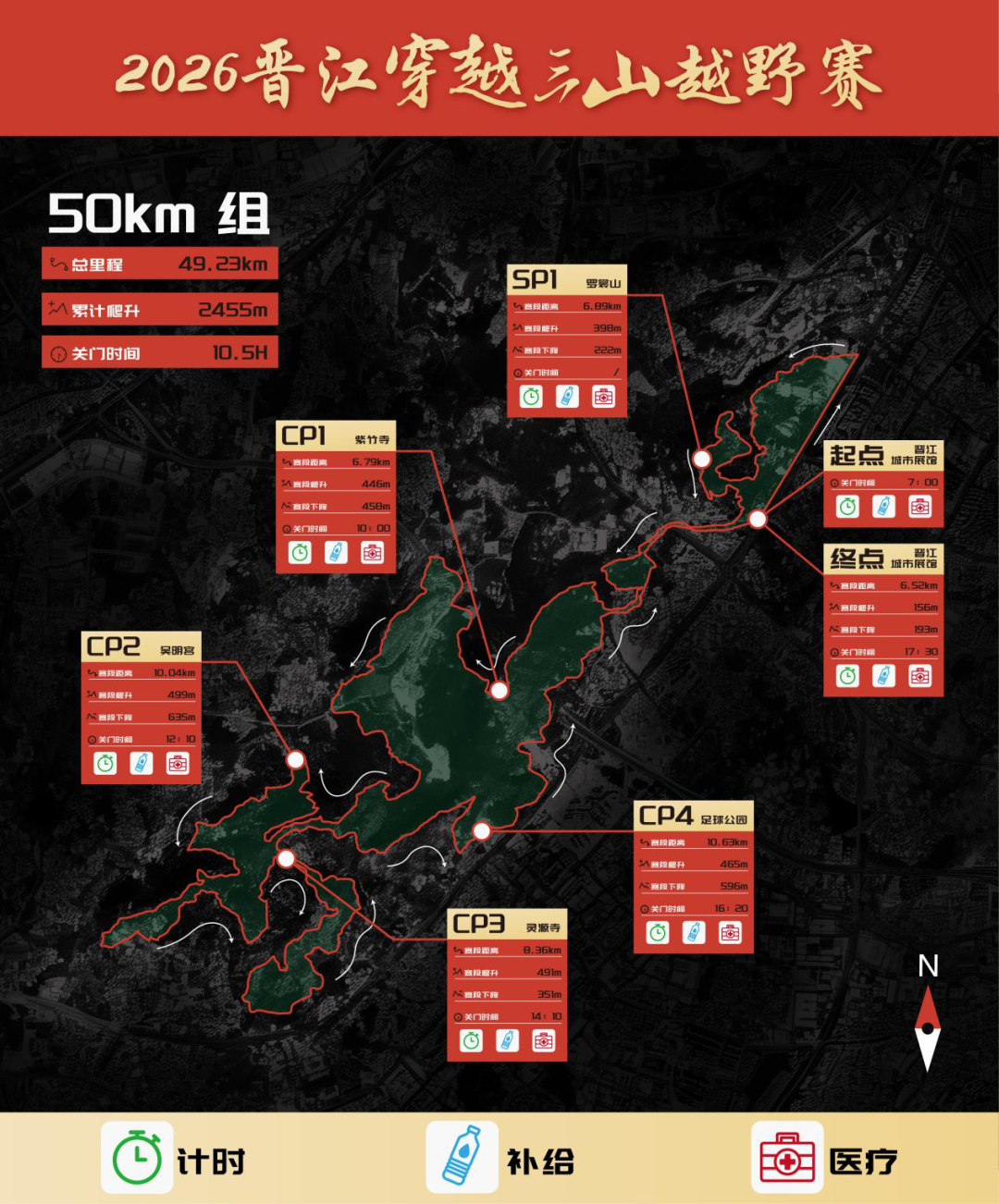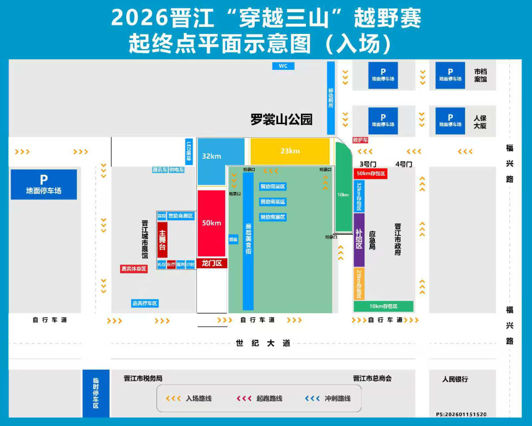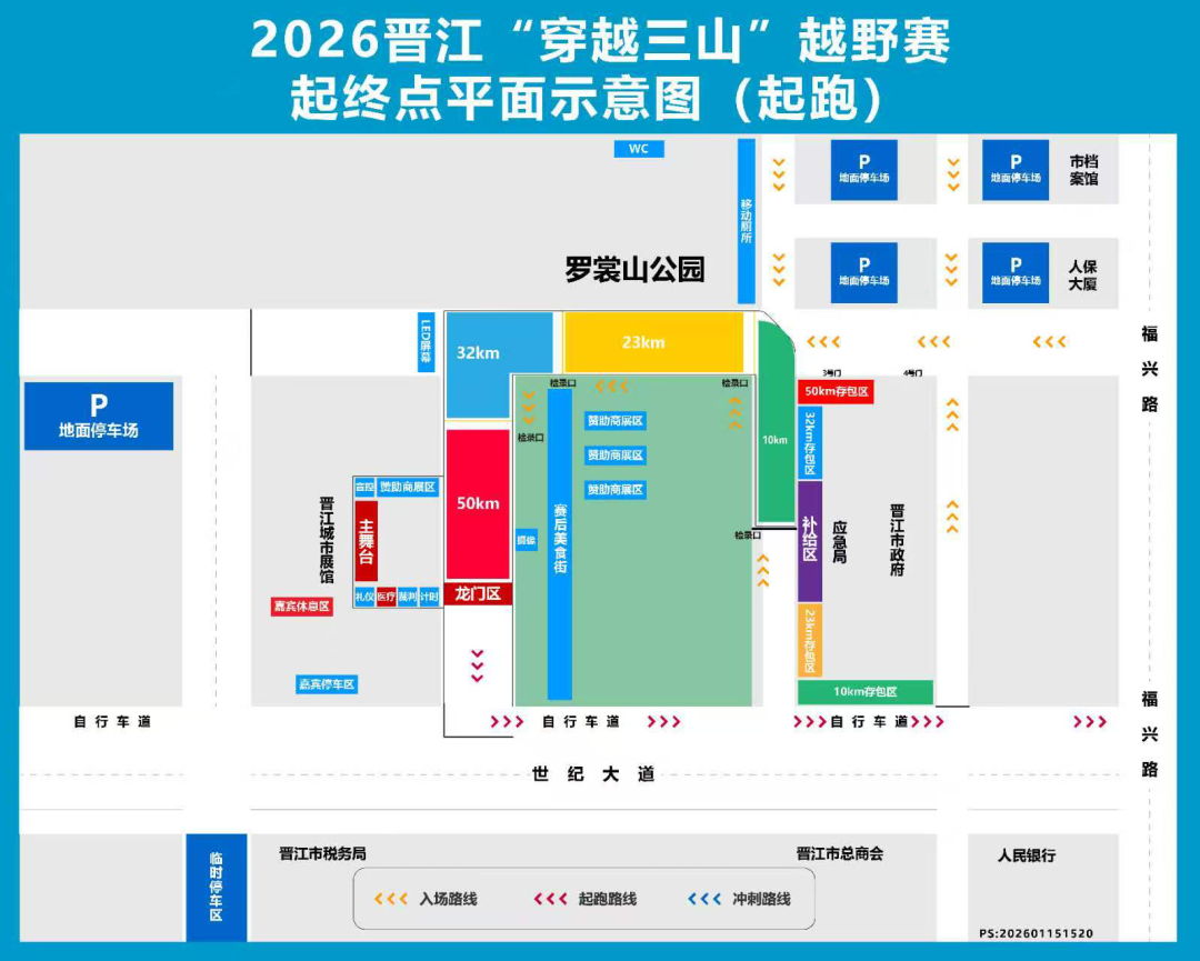 01 管制时间 2026年3月29日7:00—17:00 02 地点 晋江市城市展馆(北侧)起终点 03 赛事组别及规模 (一)赛事组别: 50KM组813人 32KM组1035人 23KM组1507人 10KM组1015人 (二)比赛线路: 50KM组比赛线路:晋江城市展馆(起点)→世纪大道→行政服务中心→天福寺→罗裳山→晋光路→草庵→华表山→紫竹禅寺→双宅水库→灵源山→吴明宫→湖池头村→灵源禅寺→山兜村→灵源山木栈道→灵源禅寺→足球公园→自行车道→龙泉书院→晋光路→金玛国宾酒店→城市展馆(终点)。