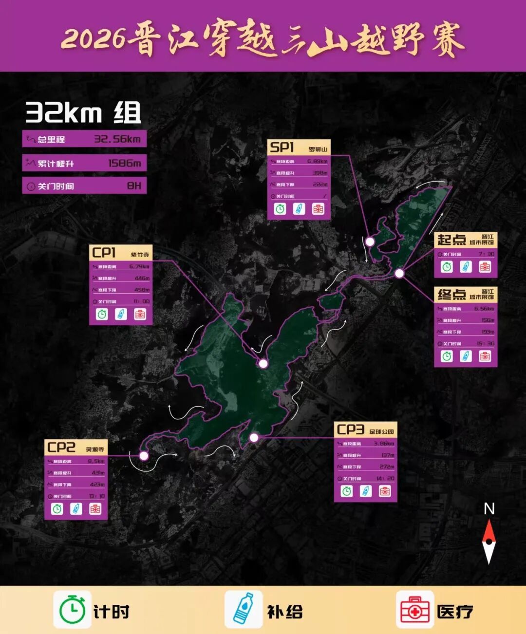32KM组比赛线路:晋江城市展馆(起点)→世纪大道→行政服务中心→天福寺→罗裳山→晋光路→草庵→华表山→紫竹禅寺→双宅水库→灵源山→灵源禅寺→足球公园→自行车道→龙泉书院→晋光路→金玛国宾酒店→城市展馆(终点)。