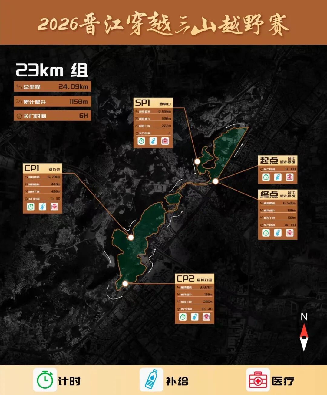 23KM组比赛线路:晋江城市展馆(起点)→世纪大道→行政服务中心→天福寺→罗裳山→晋光路→草庵→华表山→紫竹禅寺→石刀山→足球公园→自行车道→龙泉书院→晋光路→金玛国宾酒店→城市展馆(终点)。