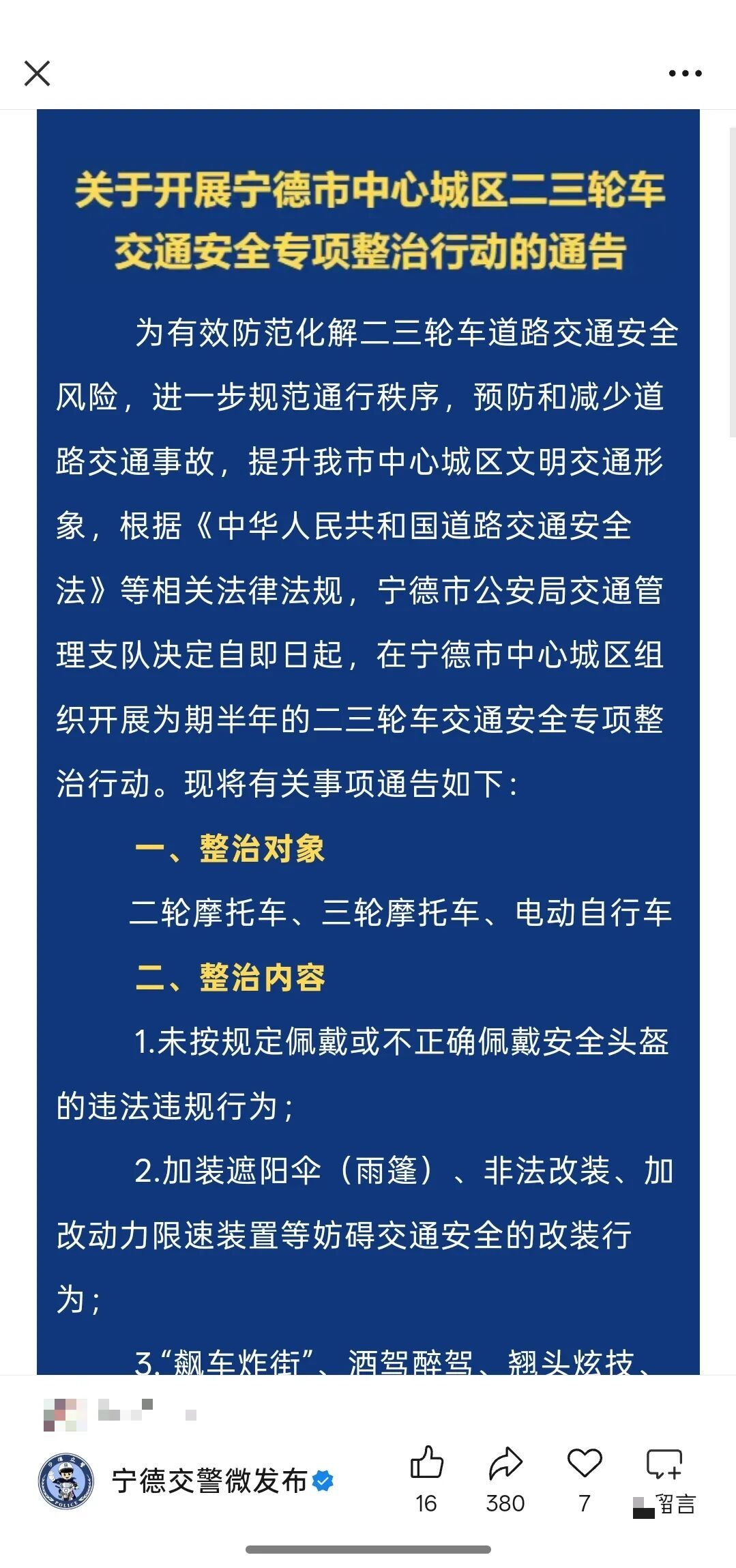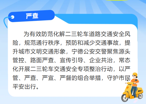 源头“体检”:把好车辆“准入关” 宁德公安交警联合相关单位深入二三轮车销售门店、维修网点开展进店全覆盖排查,重点核查车辆是否符合国标、是否存在非法改装、违规改速等行为,现场督促商家落实主体责任,严禁销售超标车辆、杜绝违规改装,从源头把好车辆“准入关”,从根源消除安全隐患。