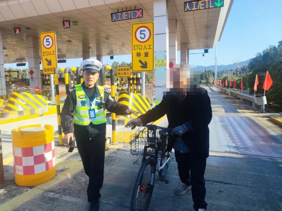 近日,宁化收费站,一位70多岁老人骑自行车欲入高速公路,原因竟是较少接触高速,出于好奇想“看一看”并锻炼身体。执勤民警迅速将其带至安全区域,通过普法教育,老人才知晓:非机动车严禁进入高速公路。