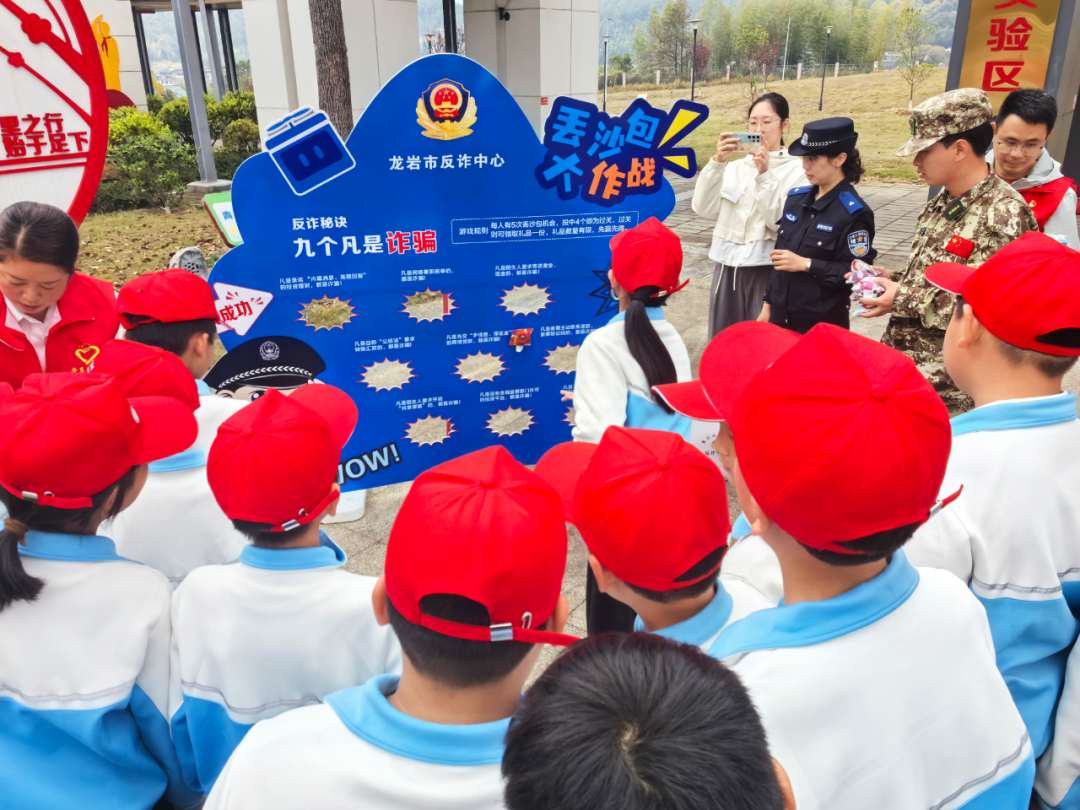在户外互动体验区,市局反诈中心、上杭县公安局交管大队联合为上杭县蓝溪小学、稔田小学孩子们打造沉浸式安全闯关体验。