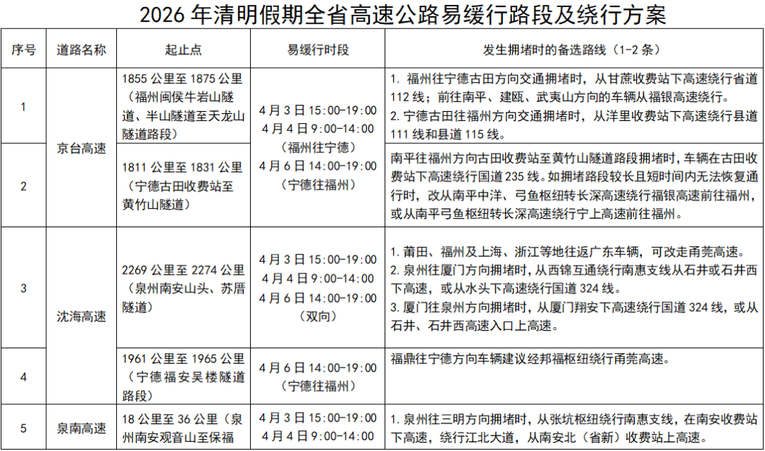 节日期间,近郊短途出游、祭祀扫墓出行相互叠加,高速公路及墓区、景区、城郊周边道路交通流量将明显上升。 福建公安交警提示:关注天气变化,合理规划行程,安全文明出行。 一、假期天气情况 假期整体以阴雨天气为主。其中,4月4日全省阴有小雨,局部有阵雨;4月5日全省阴有小雨,中北部部分地区雨势稍大;4月6日全省阴有小雨,内陆局部有中雨,部分地区可能伴随短时强降水。 二、道路通行状况 01 车流变化趋势 全省车流以城区向县市区、农村地区扩散为主。4月3日16时至21时,将出现集中出程高峰,城市环线、高速公路出入口及城郊连接道路易出现排队缓行现象;4月4日至5日,9时至13时车流量较大,墓区、陵园周边道路、景区匝道、国省道平交路口及高速公路互通、隧道等节点易拥堵缓行;4月6日15时至21时,将迎来集中返程高峰。 02 全省主要祭扫点