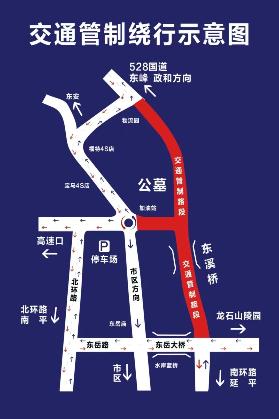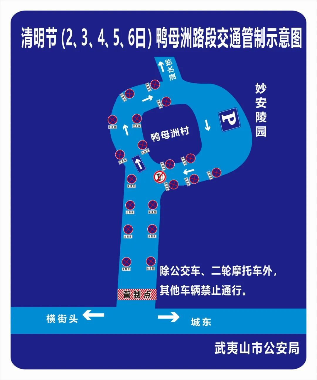 4月4日至4月6日(清明节期间),每天7:00至17:00 建瓯市东岳大桥至公墓路段、高速口至东溪大桥路段,实行交通管制,禁止一切车辆通行。有关事项通告如下: 1、由东往西进市区、或前往延平方向的小型车辆,请就近往川石、东游、东峰等高速入口上高速绕行;或经工业园区绕行。 2、由西往东前往东峰、东游、川石、松溪、政和方向的小型车辆,可从南环路-东岳大桥-建安路-东门高速环岛-工业园区-528国道绕行。 3、由东往西前往延平的大型客货车辆,可临时经由工业园区—北环路—东岳路—东岳大桥—南环路绕行。 4、由延平前往徐墩、建阳、浦城方向的大型客货车辆,可临时从瓯宁路—金瓯街—中山西路—建州大道进行绕行。 5、由延平前往东峰、政和方向的大型客货车辆,可临时从瓯宁路—金瓯街—中山西路—建州大道—北环路—工业园区进行绕行。 6、清明节期间,为避免公墓周边道路发生拥堵,建议我市市民避开祭扫高峰时段,错峰前往祭扫,尽量依靠公共交通出行,公交车一律在汽车东站停靠上下客,请过往乘客自行前往,排队等候上车。 四、武夷山市 清明期间,每天07:00-16:00,对通往妙安陵园祭扫的路段实行车辆交通管制。