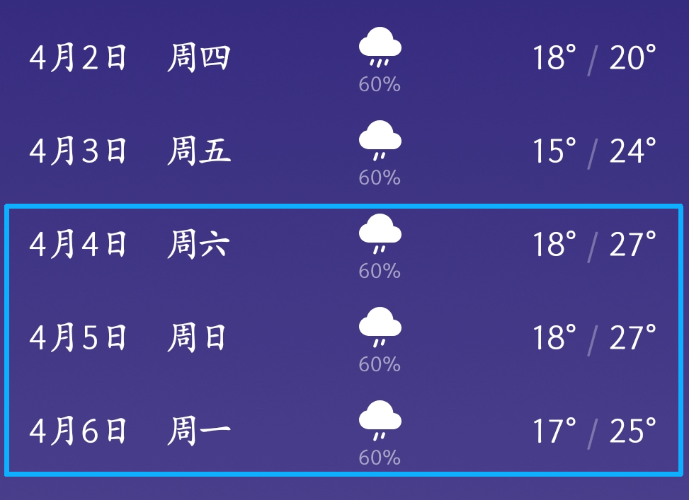 假期安排:4月4日至6日放假,共3天 高速免费:2026年清明节假期高速公路7座以下(含7座)小型客车免费通行,免费通行时间为3天,4月4日00:00开始至4月6日24:00结束。 PART.02 天气预测