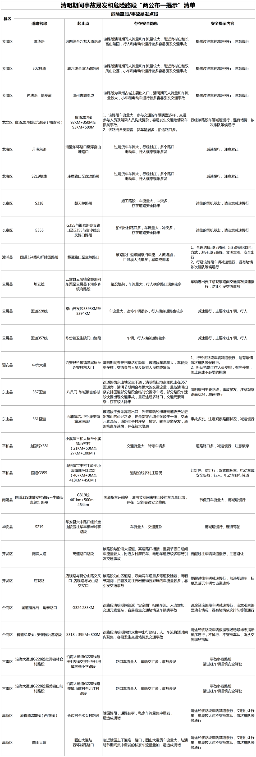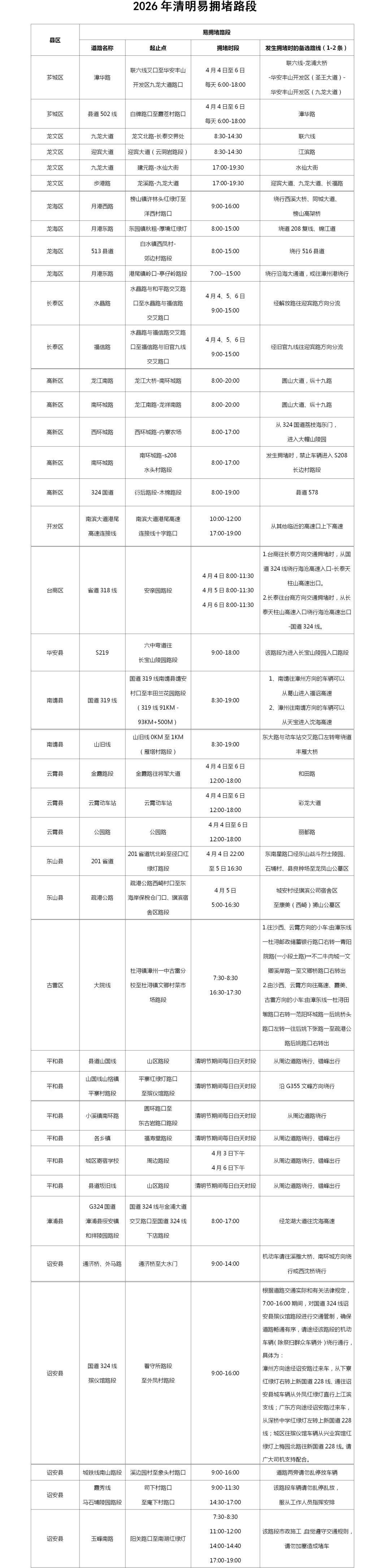 2026年清明节假期为4月4日至6日(共3天),期间群众祭扫、踏青出游、返乡探亲出行增加,车流人流大幅攀升,且假期多阴雨天气,为保障群众平安顺畅出行,漳州市公安局交通管理支队结合天气、路况及安全管控要求,发布“两公布一提示”,请广大交通参与者提前规划、文明出行、安全祭扫。 PART.01 放假通知