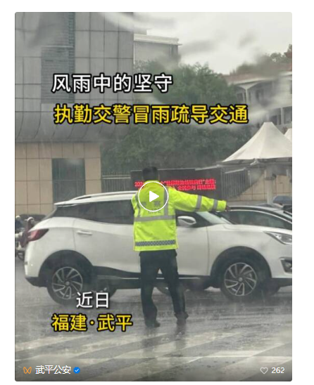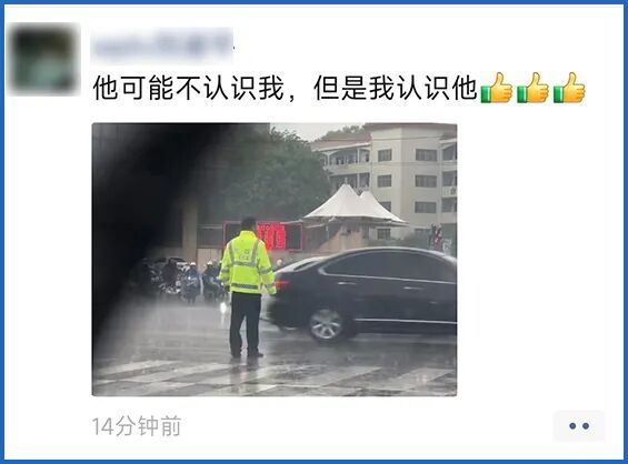 “他可能不认识我 但是我认识他” 近日,福建武平 一名交警在雨中 疏导交通的感人一幕 被过往群众拍下 并发到了朋友圈
