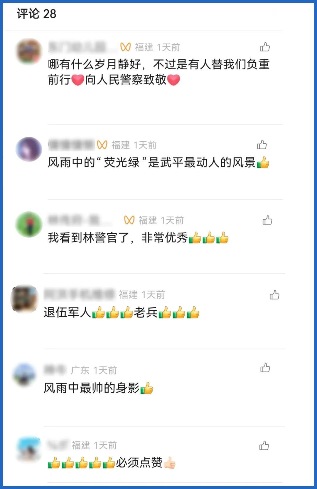 ▲道路逐渐恢复畅通 视频发出后 群众纷纷点赞评论 有网友留言 “我看到林警官了 非常优秀 也有人感慨 “风雨中的‘荧光绿’ 是武平最动人的风景”