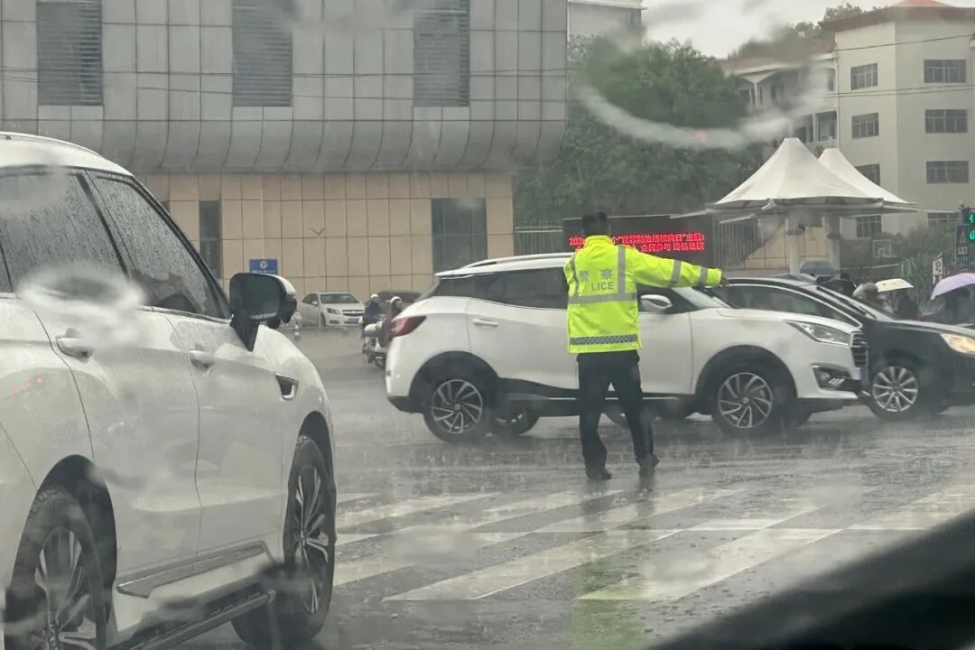 ▲群众拍下交警在雨中疏导交通 事情发生在 3月31日12时许 正值学生放学高峰 武平城区突降大雨 导致路面车流人流激增 实验中学十字路口出现拥堵