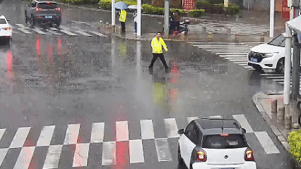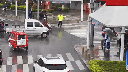 ▲大雨导致十字路口交通拥堵 正在城区路口执勤的 武平县公安局 交管大队城区中队辅警林春云 没有丝毫犹豫 来不及撑开雨伞 便毅然冲进雨幕 投入到交通疏导工作中
