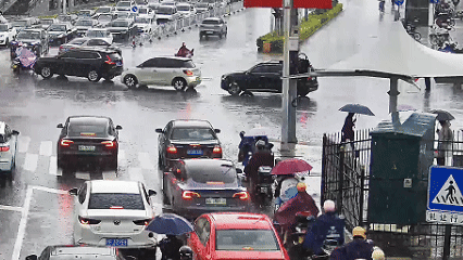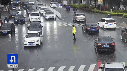 ▲林春云在雨中疏导交通 几分钟后 在他的全力疏导下 拥堵的道路逐渐恢复畅通 车辆有序通行
