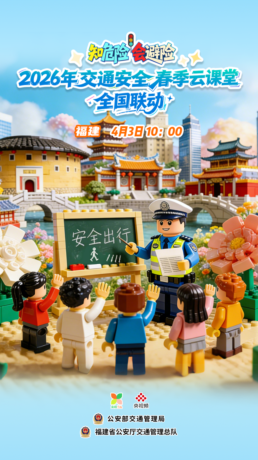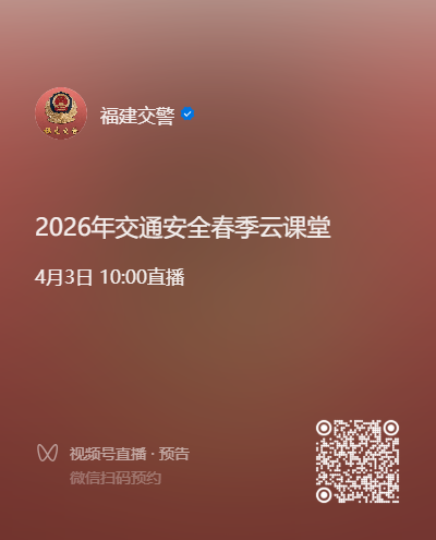 由公安部交通管理局、教育部基础教育司、中央广播电视总台体育青少节目中心、 福建省公安厅交通管理总队联合制作的“知危险 会避险”2026年福建省春季开学交通安全主题课将于2026年4月3日10:00开播! 课程采用RAP歌曲、一线交警小课堂、AI创意视频等多种形式,帮助中小学生准确掌握交通规则,有效防范因安全意识薄弱引发的交通事故。