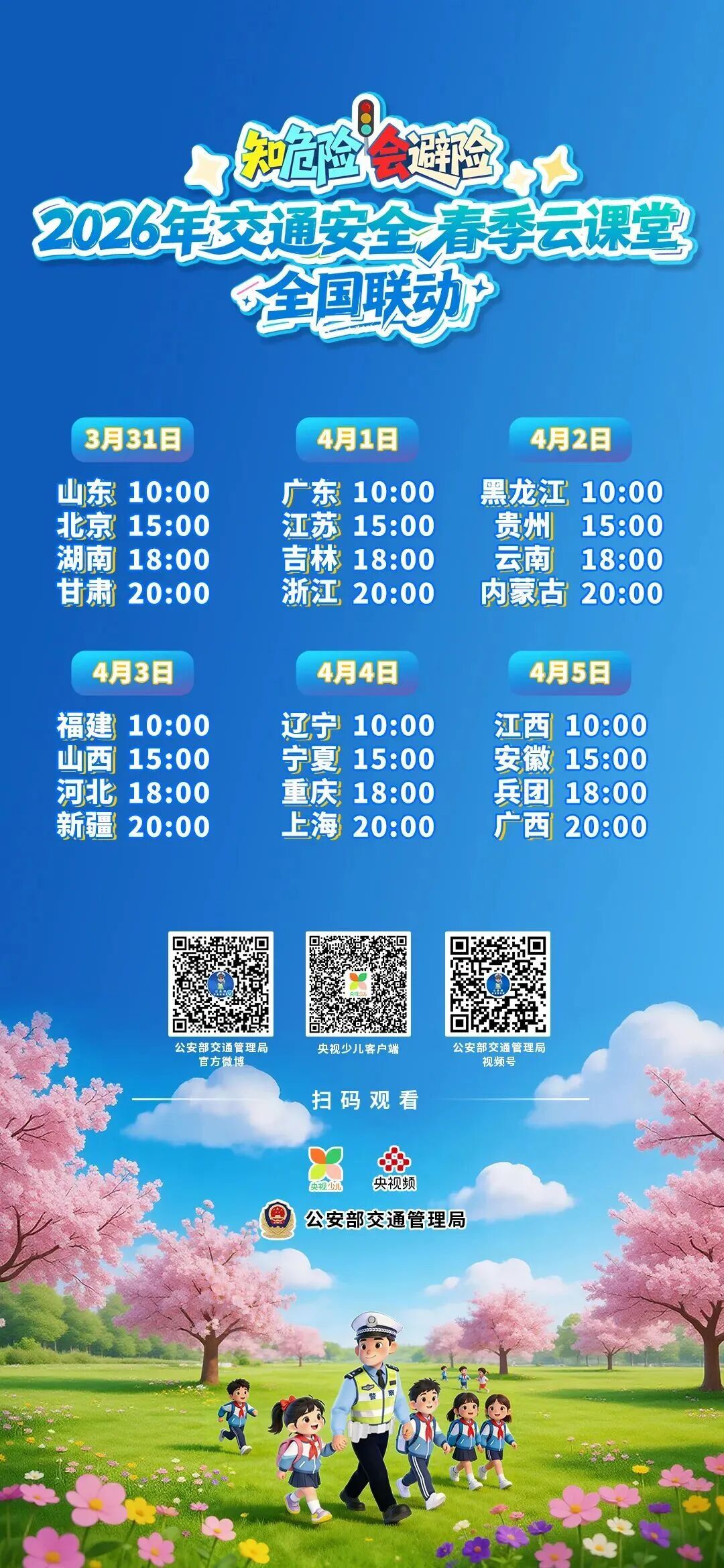 请广大师生、家长记住以下关键信息 01 直播主题 知危险会避险 2026年交通安全春季云课堂 02 直播时间 2026年4月3日(星期五) 10:00—10:27 03 直播平台 收看方式一: 央视少儿客户端 公安部交通管理局官方微博 公安部交通管理局视频号