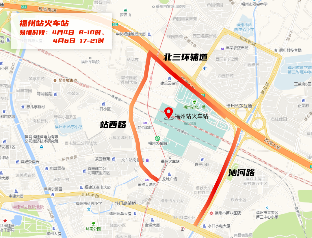 福州站火车站 易堵路段为北三环辅道、站西路、沁河路,易堵时段为4月4日8时—10时、6日17时—21时。