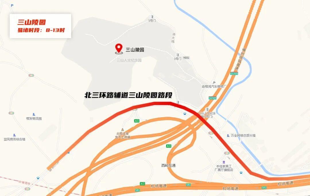 三山陵园 易堵路段为北三环路辅道三山陵园路段,易堵时段为8时—13时。发生拥堵时,三环辅道西往东经西岭互通上三环的车辆可前往永丰互通环岛掉头上三环主道绕行,东往西方向车辆可掉头经三环辅道—琴亭环岛—三环主道绕行。