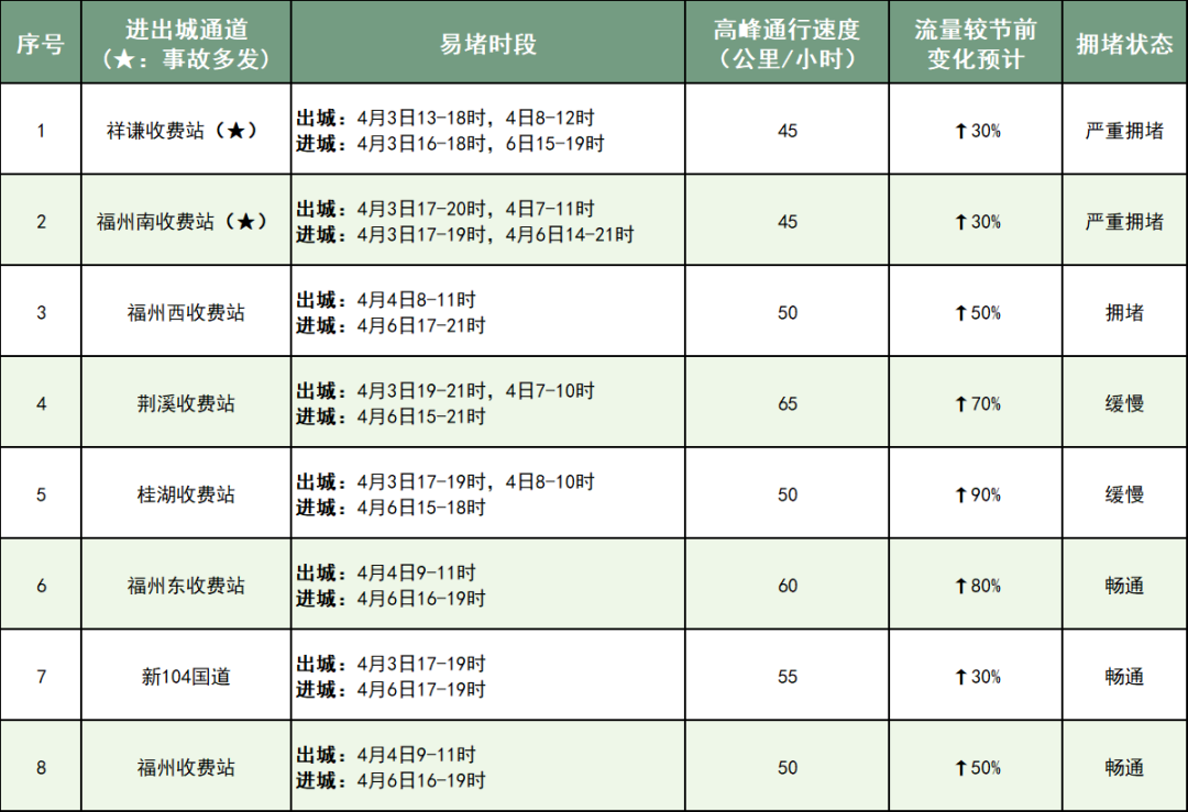 主要进出城通道 清明节城区进出城通道交通流量预计较平时上升40%,拥堵路段集中在祥谦方向的螺洲大桥、福州南方向的湾边大桥、福州西方向的建平路、荆溪方向的永丰互通及荆溪连接线光明出口路段,出城方向拥堵时段集中在4月3日(节前1天)15时—21时、4日7时—12时,进城方向拥堵时段集中在6日15时—21时。
