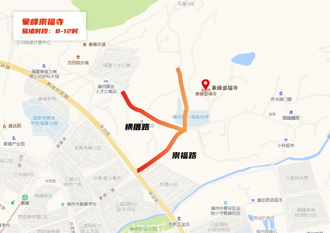 象峰崇福寺 易堵路段为崇福路、横厝路,易堵时段为7时—11时。