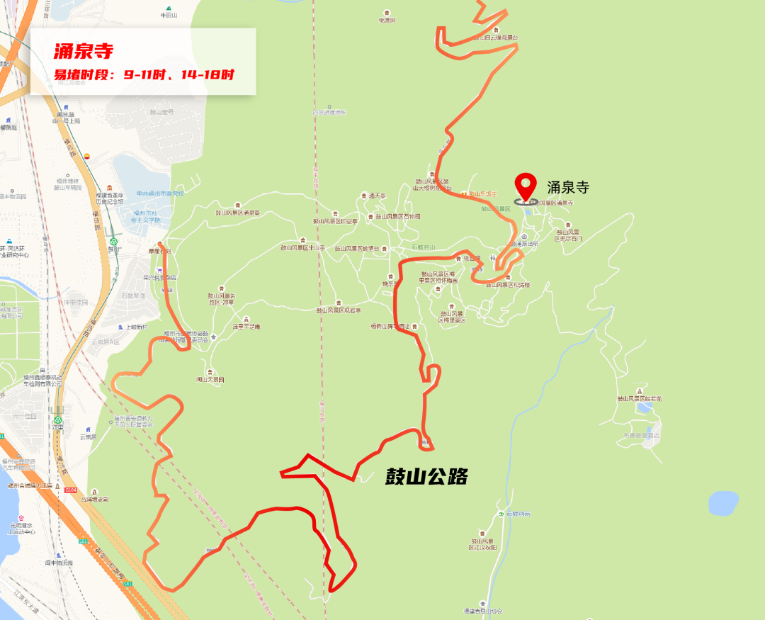 涌泉寺 易堵路段为鼓山公路,易堵时段为9时—11时、14时—18时。
