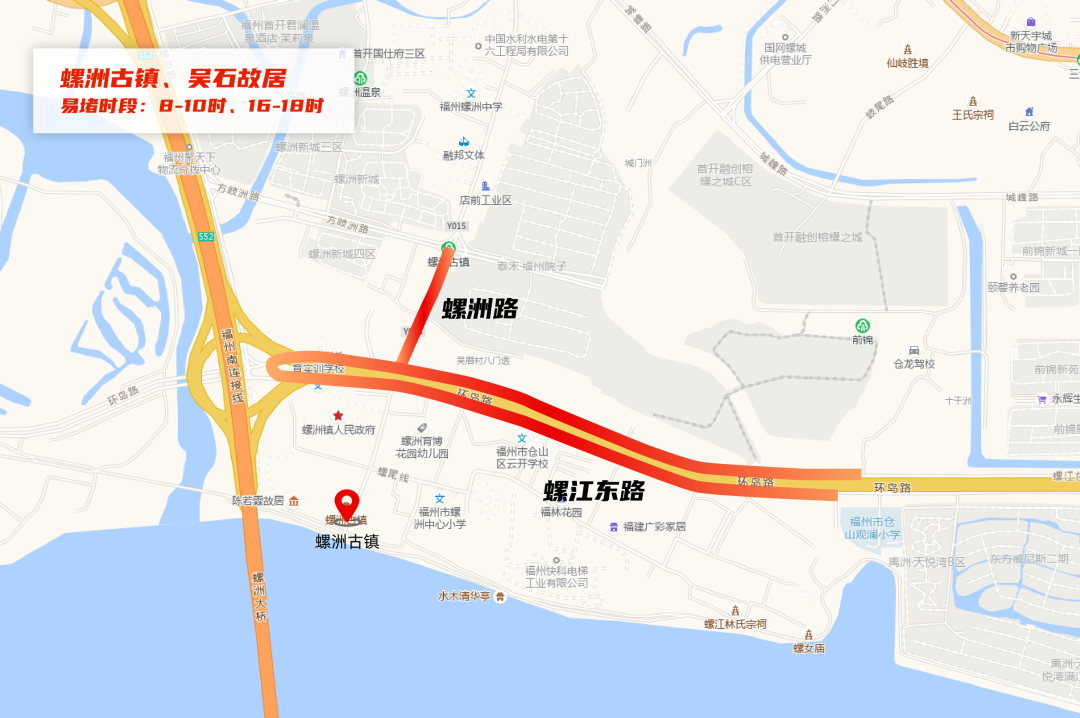 螺洲古镇、吴石故居 易堵路段为螺洲路、螺江东路,易堵时段为8时—10时、16时—18时。