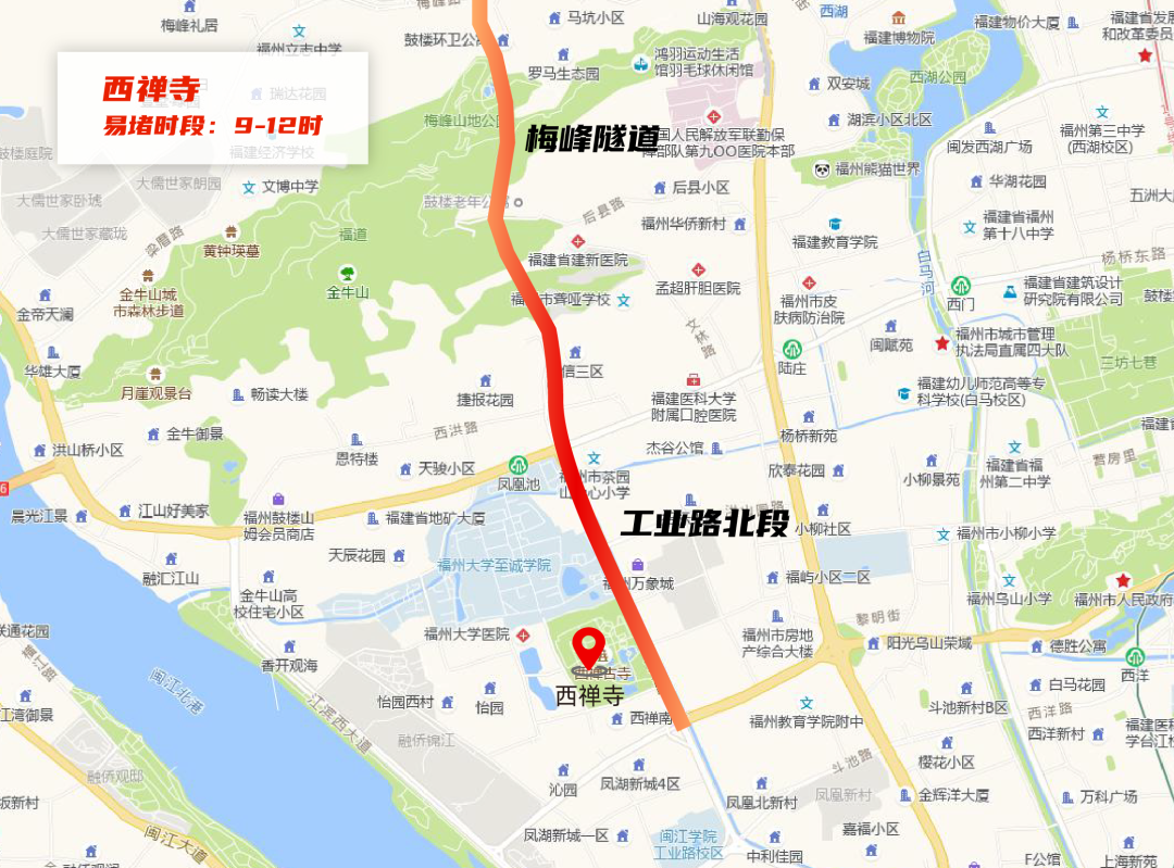 西禅寺 易堵路段为工业路北段,易堵时段为9时—12时。发生拥堵时可从江滨西大道绕行。