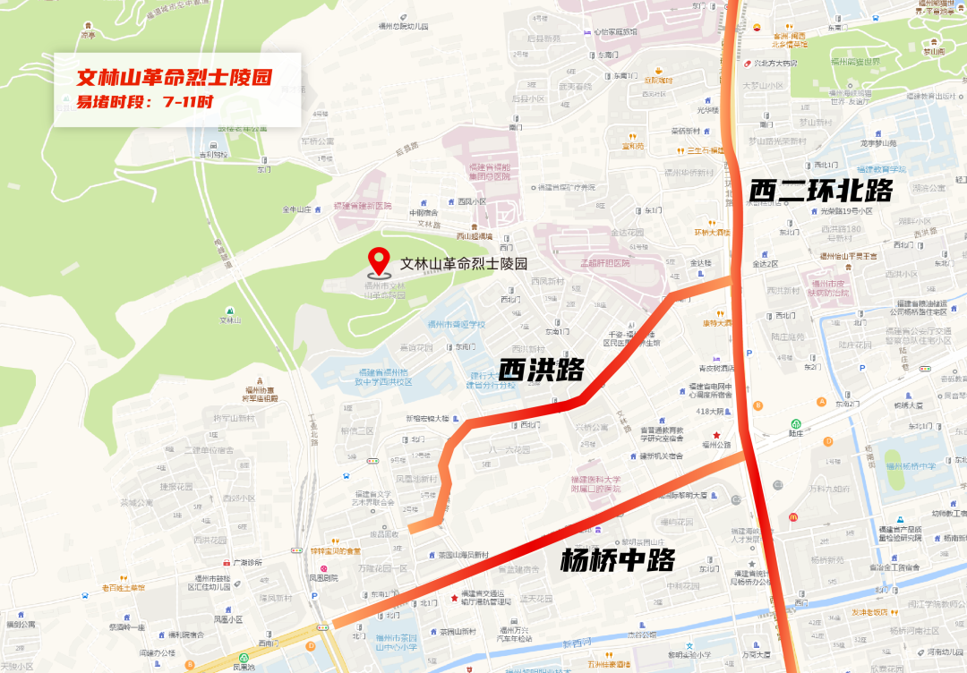 今年清明节假期为4月4日—6日(周六—周一),假期城区重要陵园及寺庙周边道路、主要进出城通道、重要交通枢纽周边道路交通流量较平时将大幅上升,极易发生拥堵。 为保障2026年清明节福州城区道路交通秩序,福州交警根据交通大数据平台研判预警,结合陵园、寺庙周边易拥堵道路交通态势制定《2026年清明节福州城区交通出行提示》。 鼓楼区易拥堵道路 文林山革命烈士陵园 易堵路段为西二环北路、西洪路、杨桥中路,易堵时段为7时—11时。发生拥堵时从杨桥路进出城的车辆可从金山大桥-乌山西路绕行。