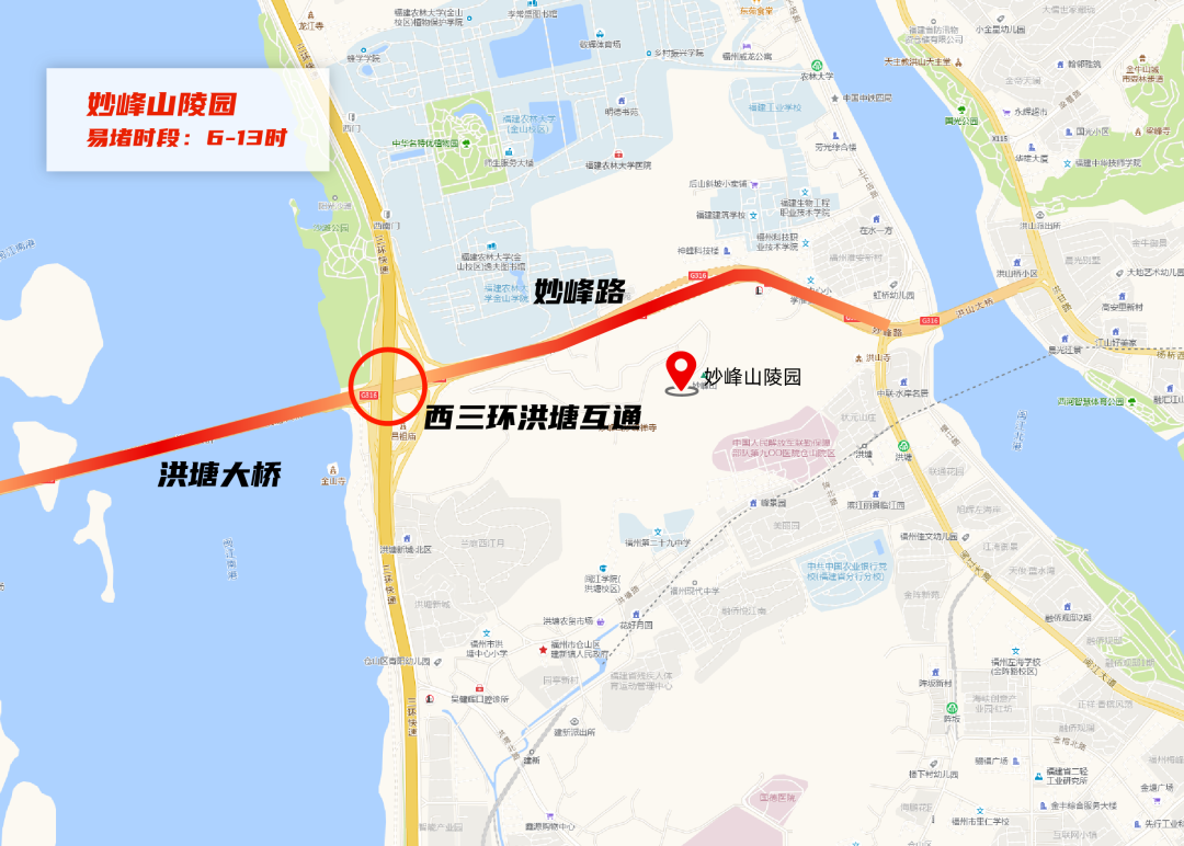 台江区易拥堵路段 清明节期间9时—11时、16时—19时,西二环“苏万宝”商圈路段、尤溪洲大桥、闽江大桥、鳌峰大桥等交通流量较大,过往车辆请注意行车安全,发生轻微交通事故时请按照“快处”方式,尽快将事故车辆撤离道路,避免造成交通拥堵。 仓山区易拥堵路段 妙峰山陵园 易堵路段为妙峰路、洪塘大桥、西三环洪塘互通路段,易堵时段为6时—13时,祭扫高峰期妙峰山上山通道较易发生拥堵,车辆排队可能影响洪塘大桥、西三环车辆正常通行,进城方向车辆可从西三环-永丰互通环岛-洪甘路或西三环-金山大道绕行。