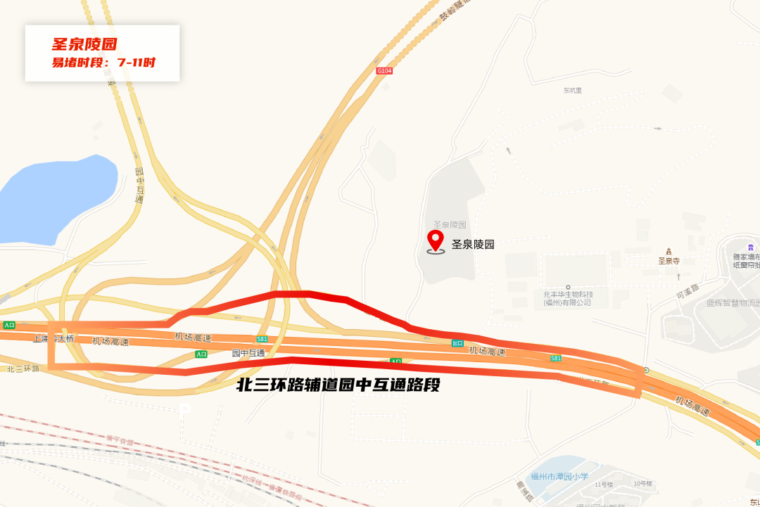 圣泉陵园 易堵路段为北三环路辅道园中互通路段,易堵时段为7时—11时,高峰时段北三环路辅道可溪路口西进口掉头车辆较多,通行缓慢,出现交通拥堵时,圣泉陵园门口三环辅道车辆将由东往西进行疏散。