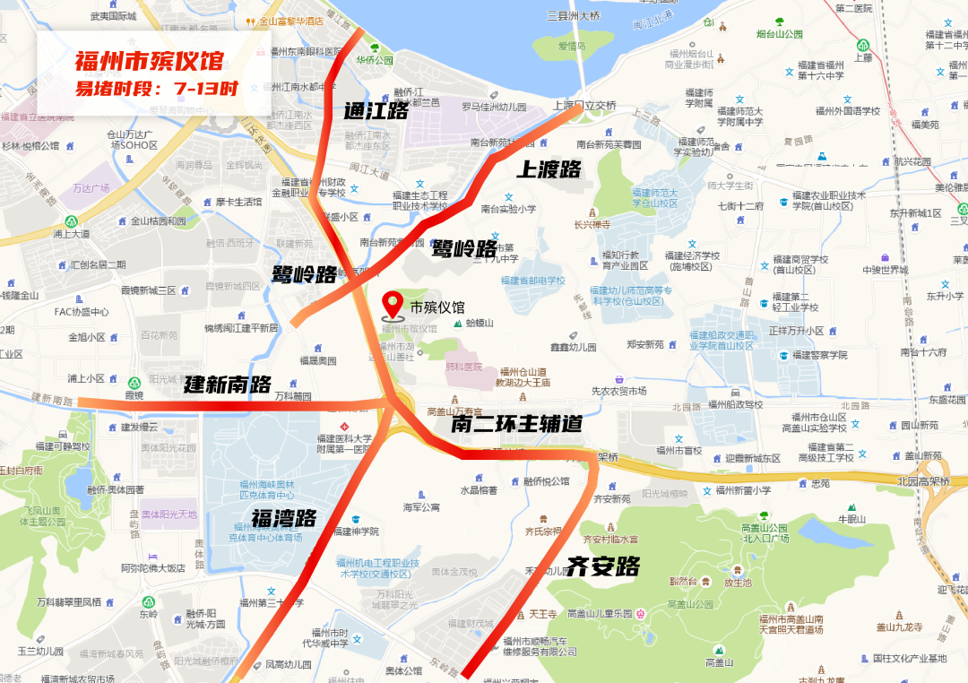福州市殡仪馆 易堵路段为南二环主辅道(齐安路—通江路)、福湾路、建新南路、鹭岭路、上渡路、通江路,易堵时段为7时—13时,其中7时—11时前往建新路奥体停车场的车辆较多,南二环辅道(齐安路—通江路)、福湾路、建新南路较易发生拥堵,10时—13时南二环辅道鹭岭路段、鹭岭路、上渡路、通江路较易发生拥堵。