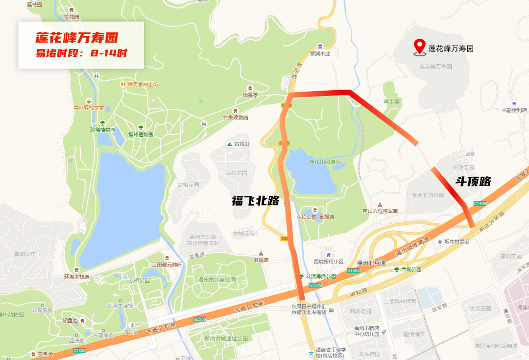 晋安区易拥堵路段 莲花峰万寿园 易堵路段为福飞北路(审知路-莲花峰路)、莲花峰路、斗顶路,易堵时段为8时—14时。