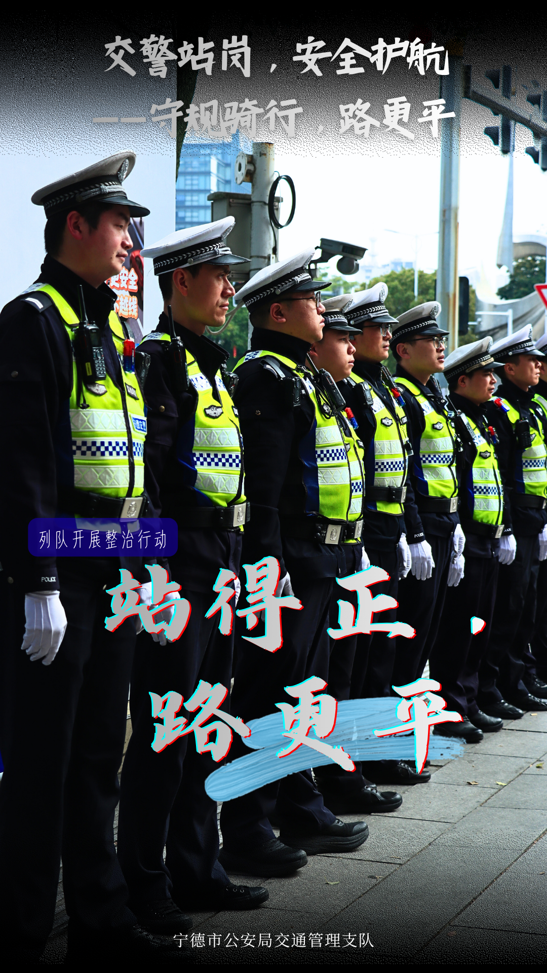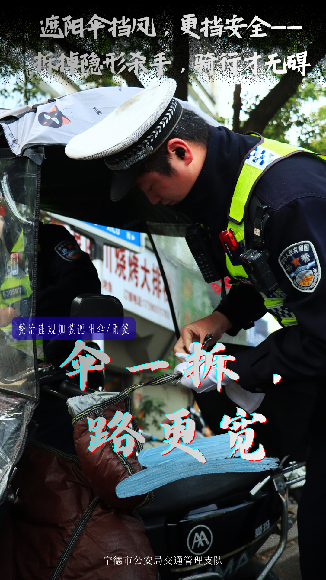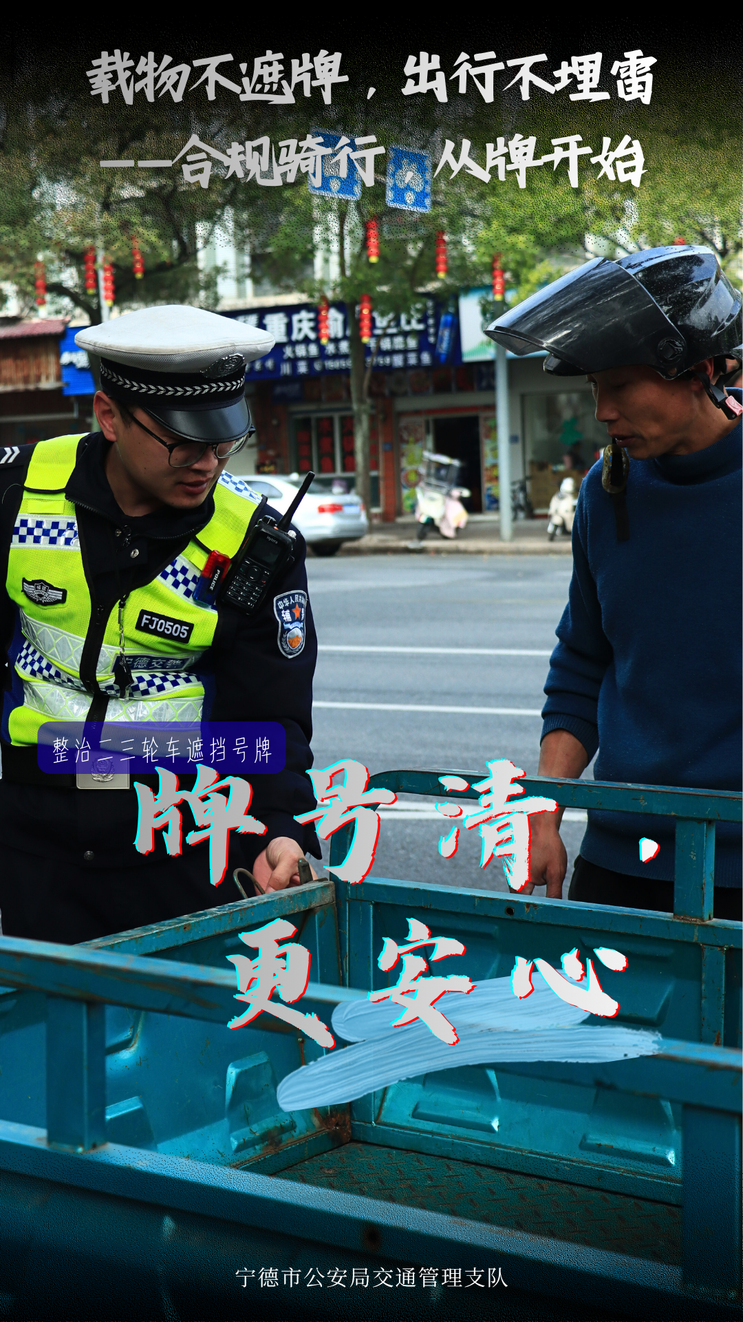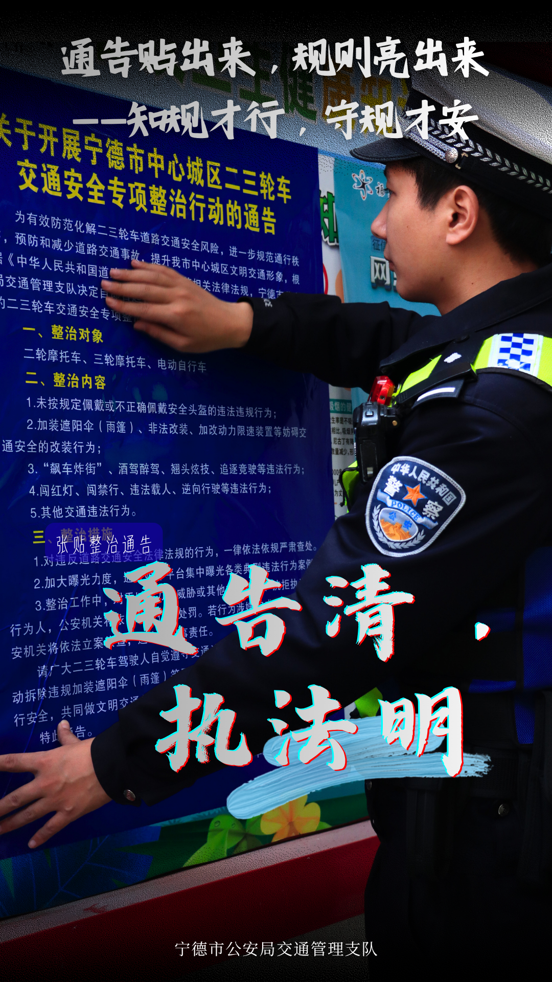 安全无小事,骑行守规矩 为进一步规范二三轮车通行秩序 宁德公安交警聚焦路面常见隐患 开展专项整治行动 从戴好头盔到拆除遮阳伞 从拒绝酒驾到合规载物 我们通过一组海报记录下这场 “有力度、更有温度”的整治行动 一起来看看宁德公安交警如何守护你我的骑行路 通告贴出来,规则亮出来 知规才行,守规才安